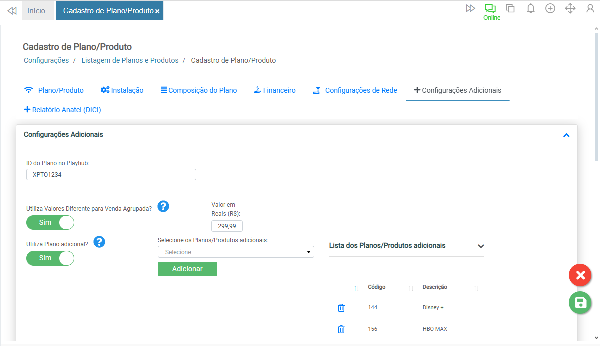 ID do Plano no Playhub - Este campo somente é apresentado quando o tipo de plano é de serviços adicionais. Nele deve ser informado o ID do plano na Playhub para habilitar os serviços de streaming e conteúdo;