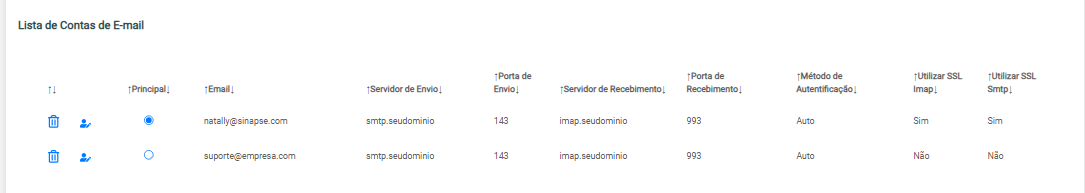 Após o cadastro, todas as contas configuradas serão listadas na Lista de Contas de E-mail, contendo as seguintes informações:
