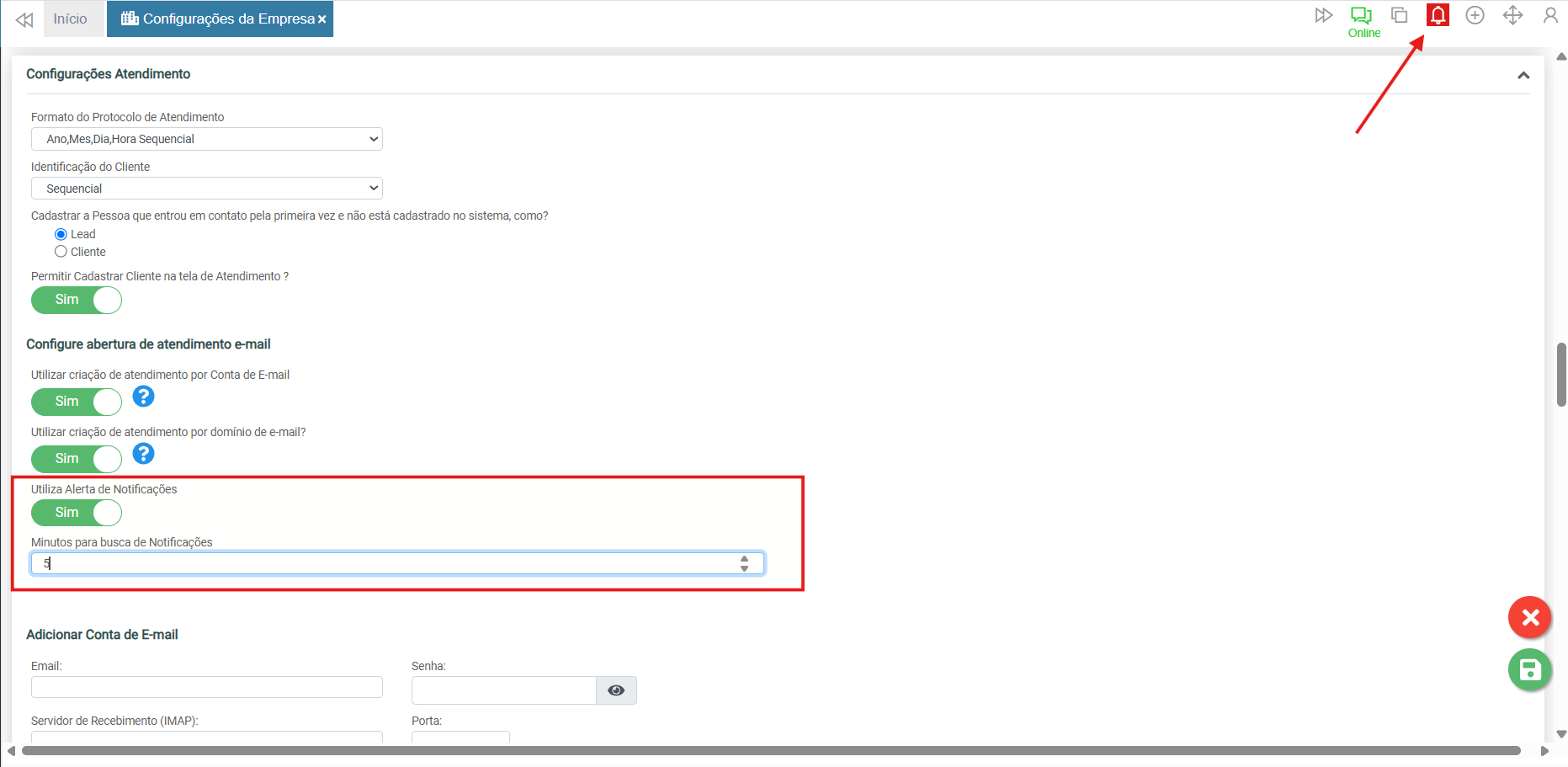 Configurações > Configurações da Empresa > Configurações Atendimento