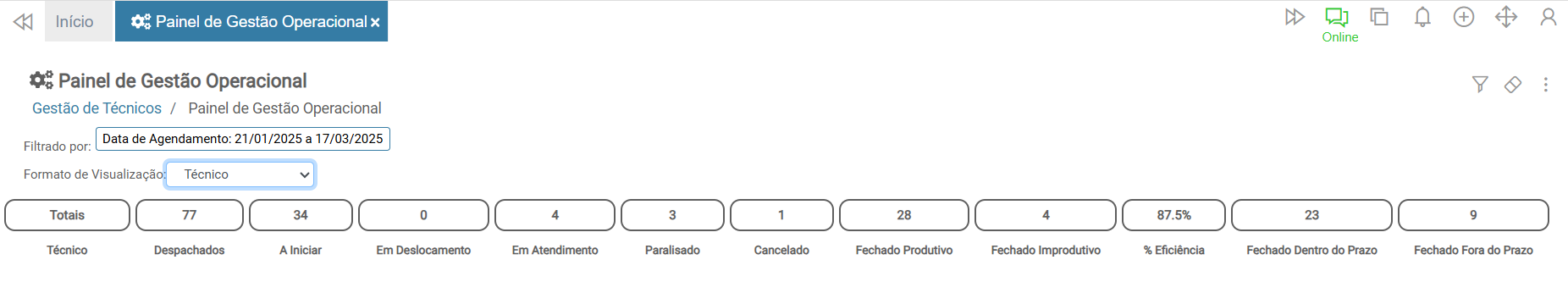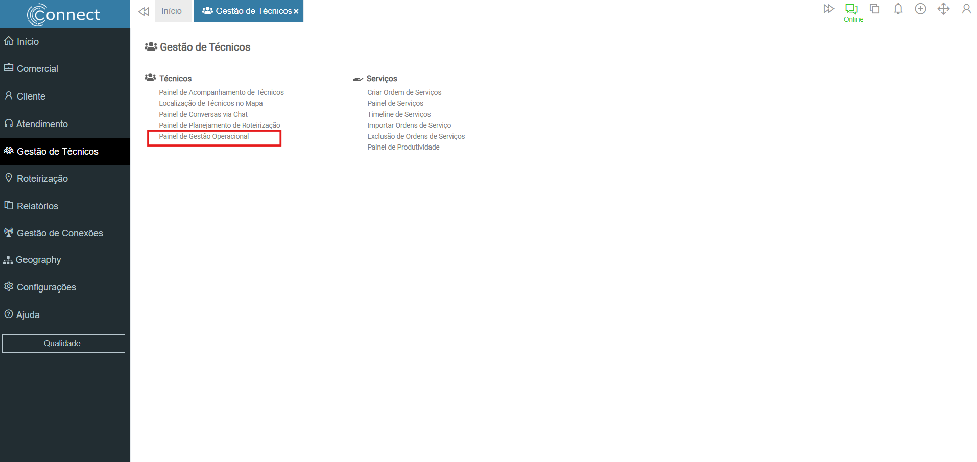 Connect > Menu Gestão de Técnicos > Painel de Gestão Operacional