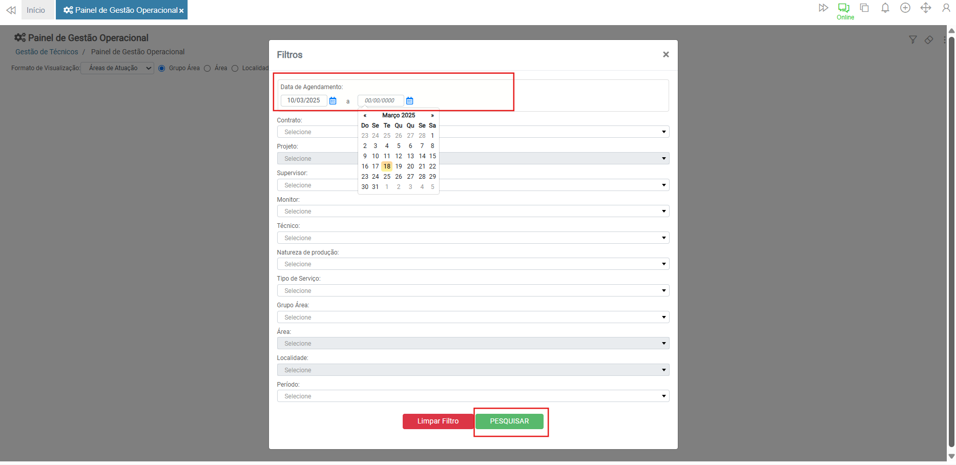 Ao acessar o recurso do Painel de Gestão Operacional, será exibido um filtro, no qual é obrigatório inserir o período desejado para busca do agendamento.