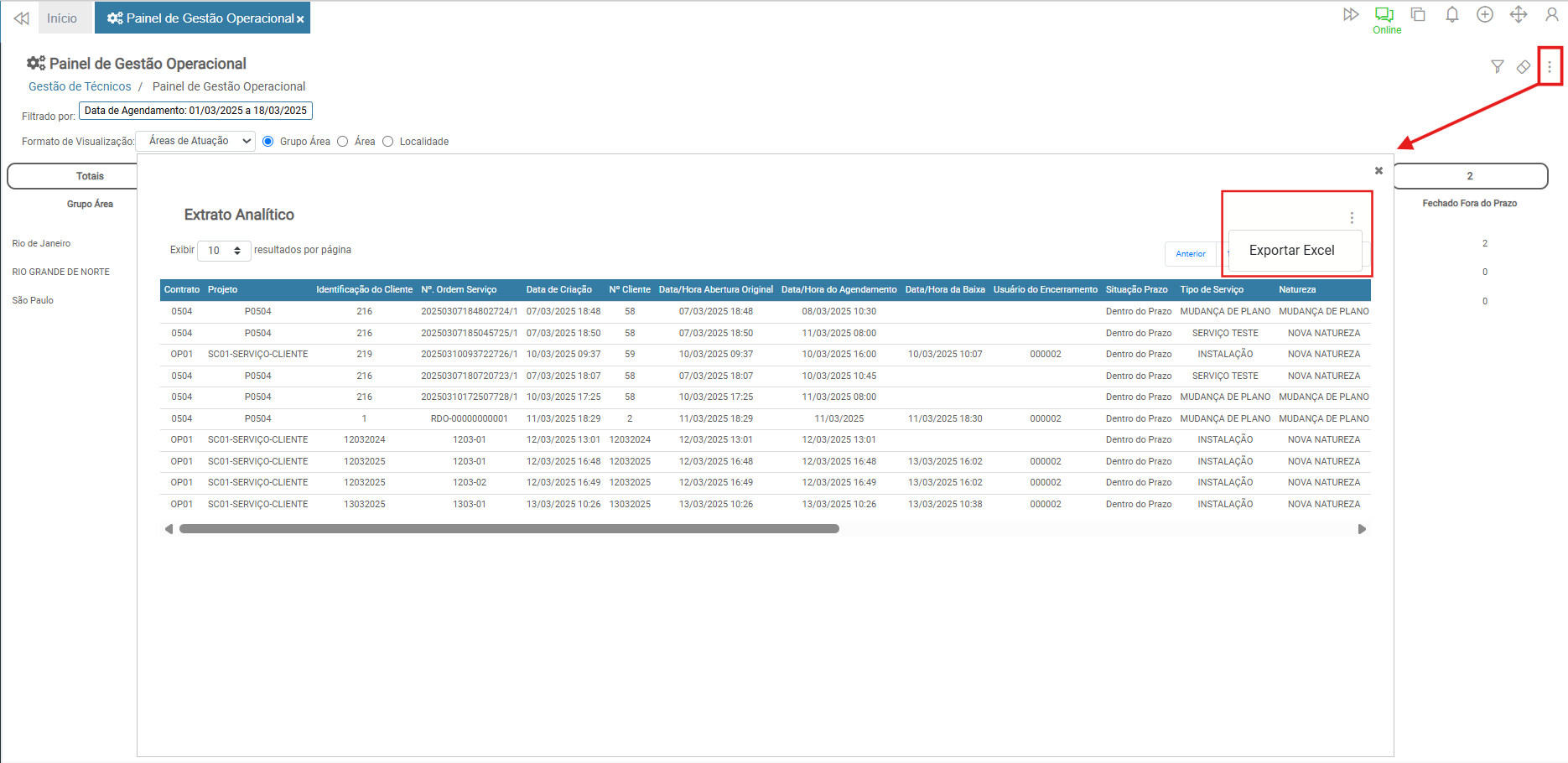 - Extrato Analítico: Exibe uma modal com o detalhamento completo de cada ordem de serviço, incluindo operações realizadas por técnicos e agentes em campo. Fornece informações aprofundadas para análise de desempenho, produtividade e eficiência, e pode ser exportado em arquivo Excel.