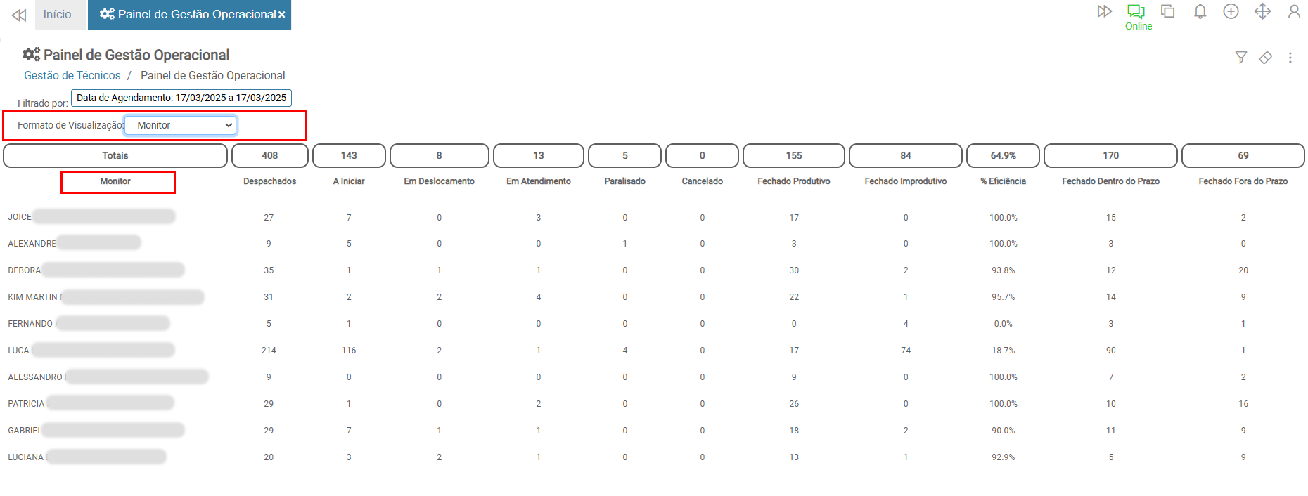Neste formato, as informações das atividades operacionais são exibidas por supervisor(es).
