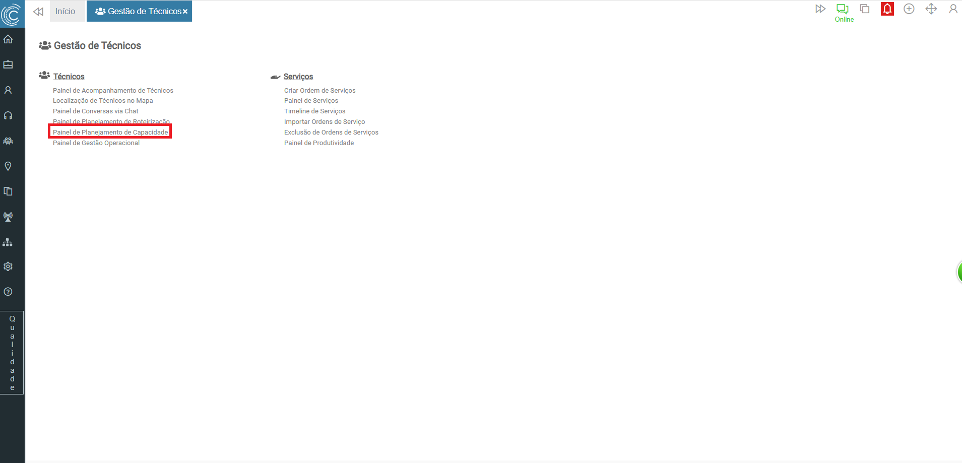 Connect > Menu Gestão de Técnicos > Painel de Planejamento de Capacidade