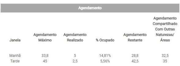 - % Ocupado: Percentual obtido pela divisão entre Agendamento Realizado e Agendamento Máximo ((realizado/máximo) x 100);
