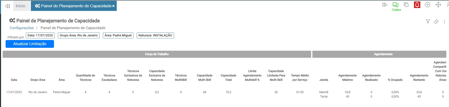 - Agendamento Máximo: Capacidade útil para agendamento por período, baseada na capacidade limitada para multiskill;