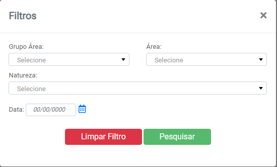 - Área: Local de atuação dentro do Grupo Área. O cadastro é realizado na tela Cadastro de Área.