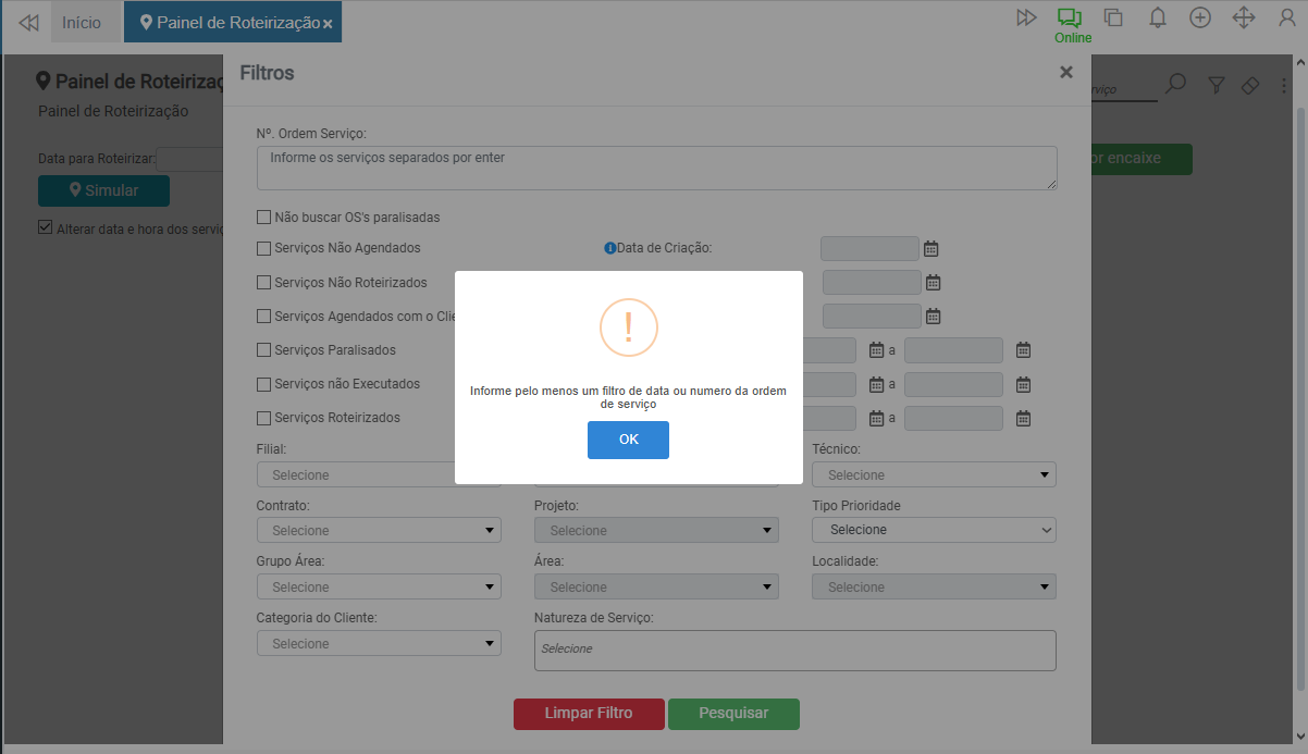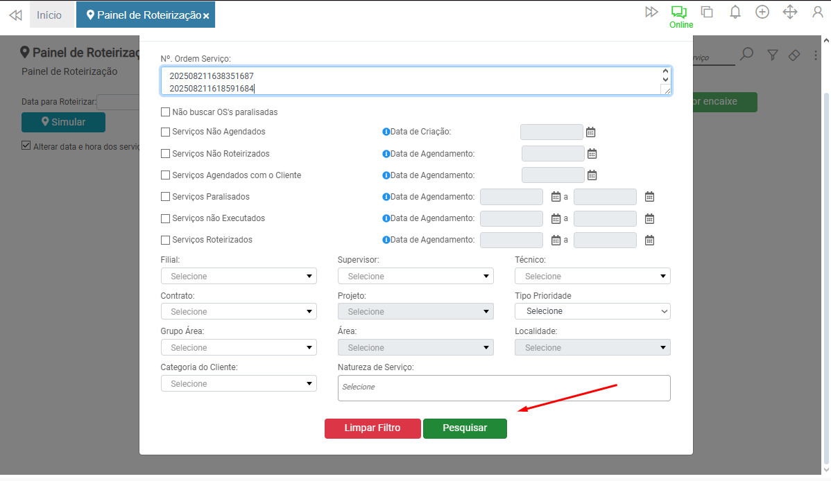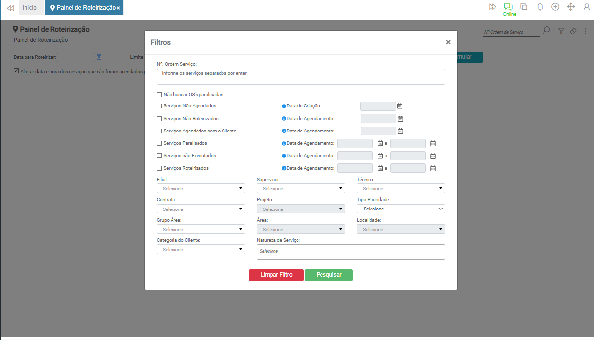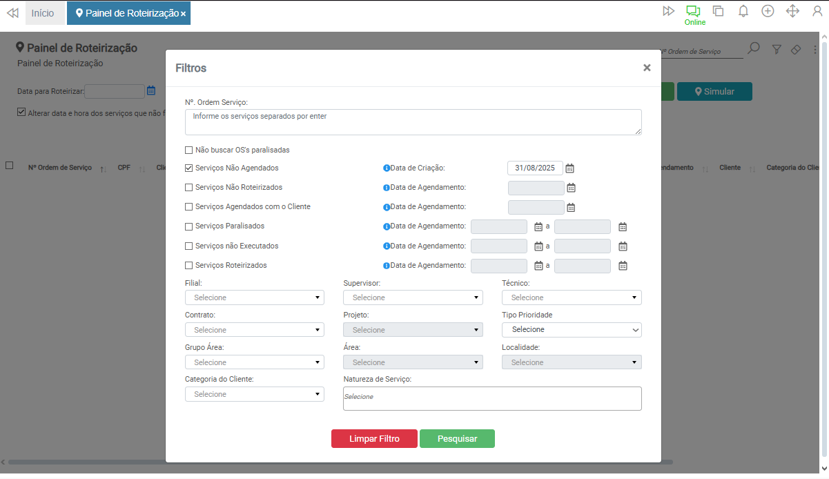 Ao acessar o menu de roteirização, é exibido um painel de fundo com uma tela de filtros em primeiro plano para consultar serviços pendentes. As opções de filtro disponíveis são: