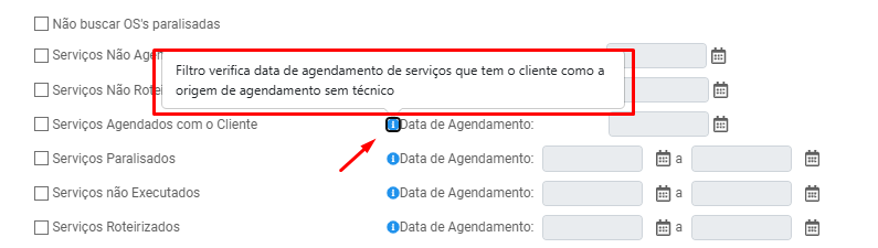 Para auxiliar na escolha dos filtros, clique no ícone azul de informação à direita do filtro, que exibe detalhes sobre a consulta a ser realizada.