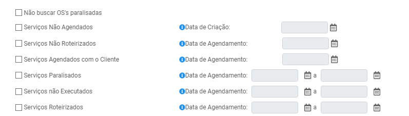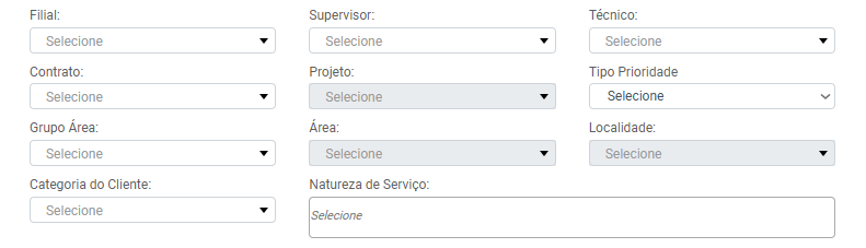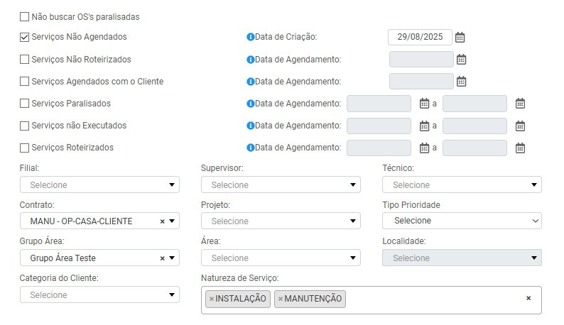 Esses filtros devem ser combinados com as opções de status ou situação das ordens de serviço, conforme o exemplo abaixo: