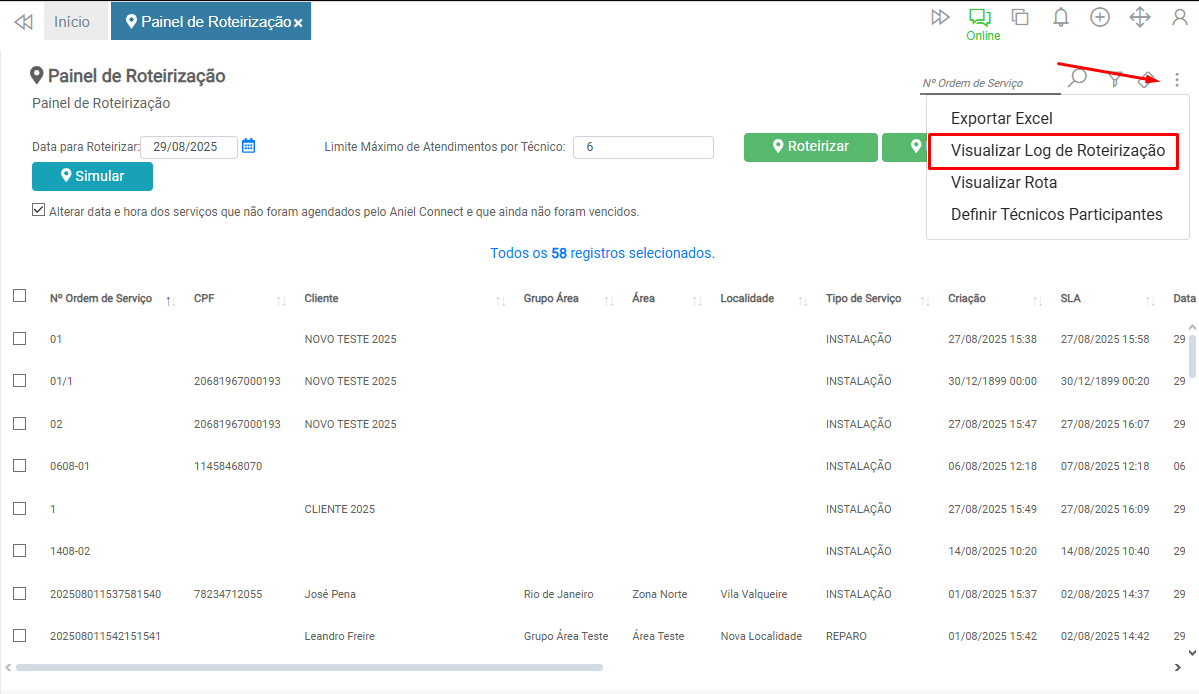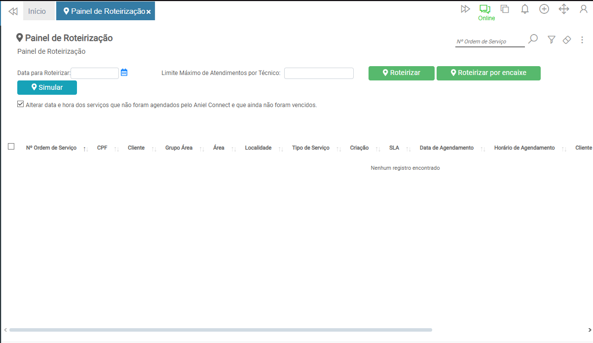 O painel de roteirização exibe as ordens de serviço localizadas com base nos filtros aplicados. Nele, é possível simular uma roteirização, distribuir todas ou algumas ordens de serviço pendentes para técnicos elegíveis ou específicos, analisar o log dessas ações e visualizar a rota definida para os técnicos.