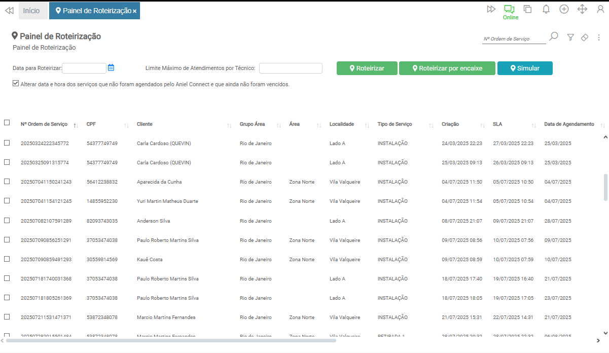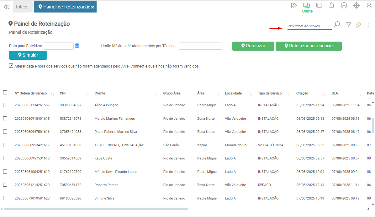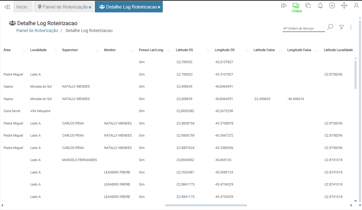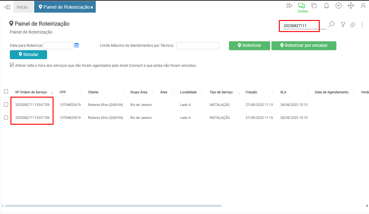 Se a consulta for válida, as ordens de serviço encontradas serão exibidas no painel de roteirização, como nos exemplos abaixo: