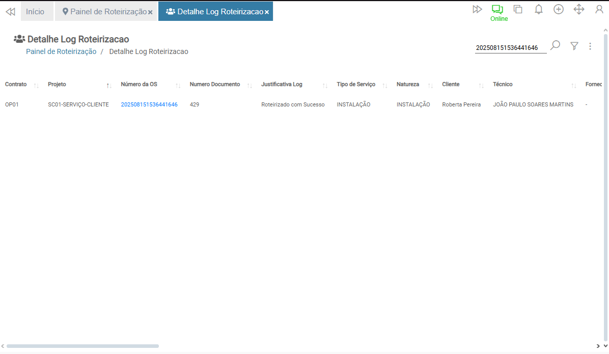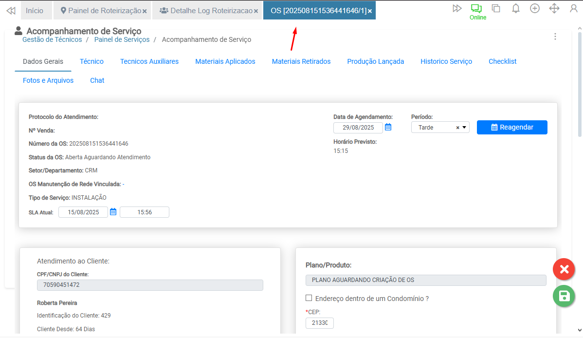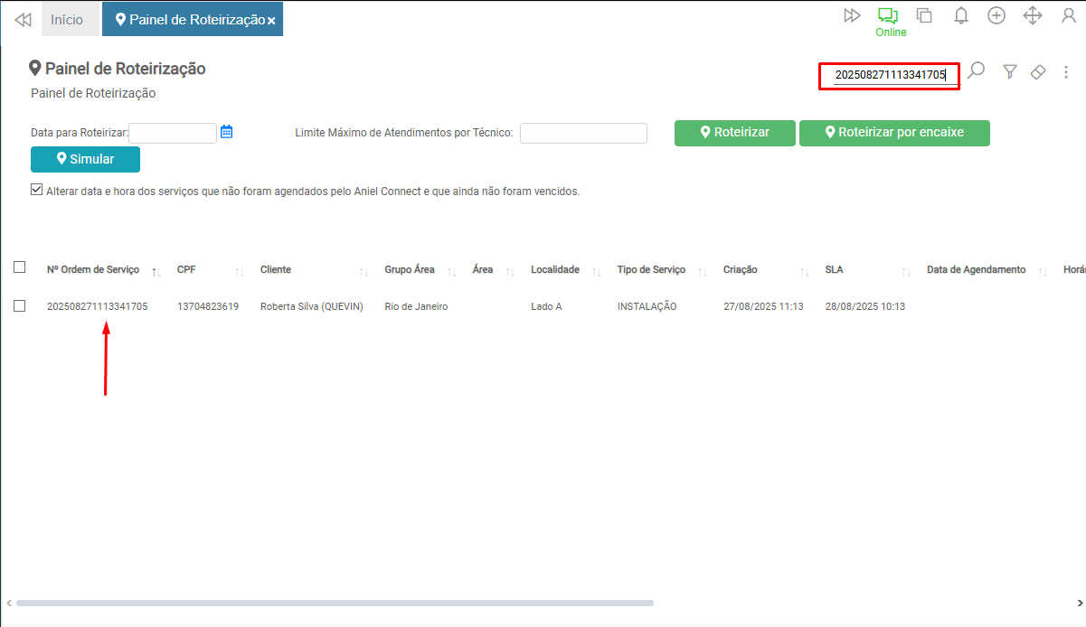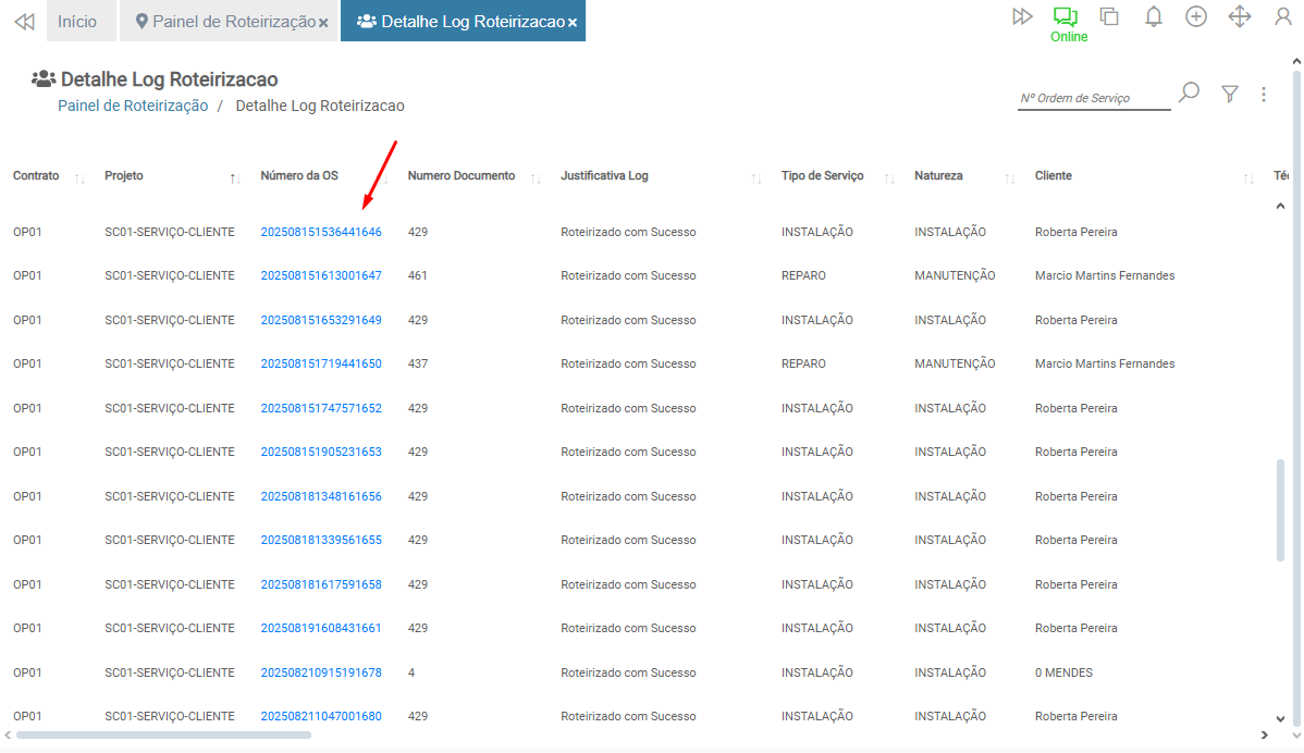 Ao clicar no número da ordem, uma nova aba do Aniel Connect será aberta na tela de acompanhamento do serviço, facilitando análises e ajustes.