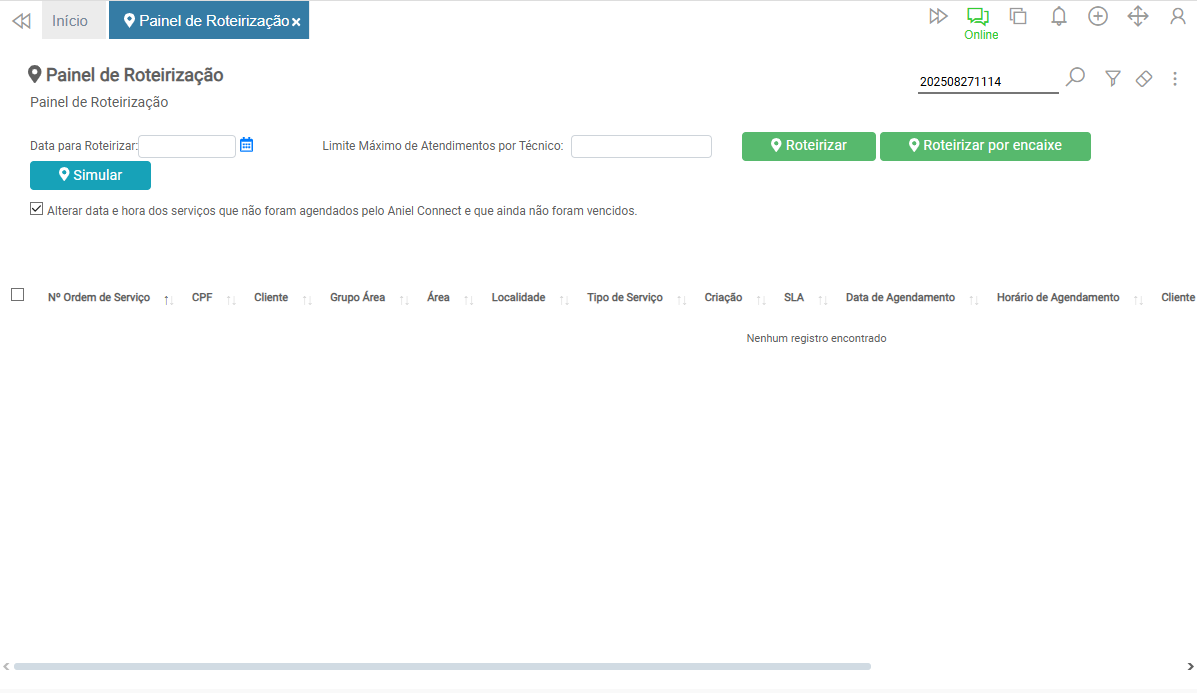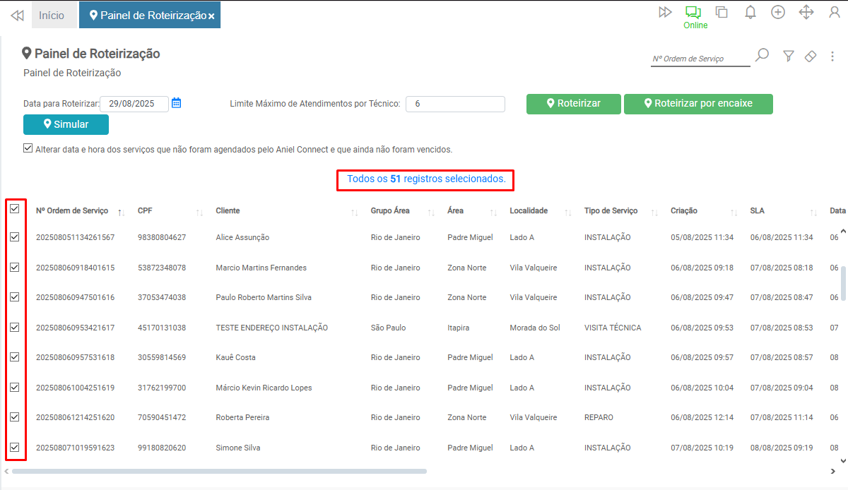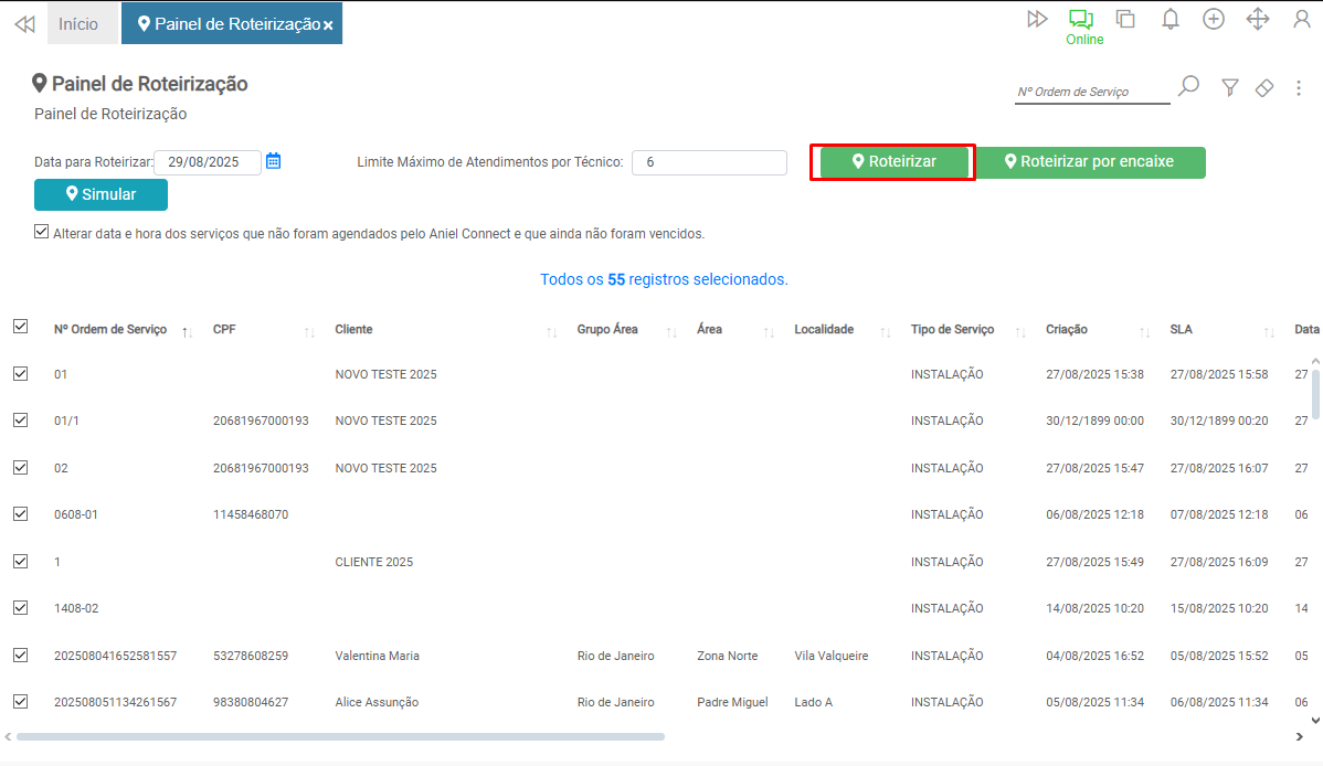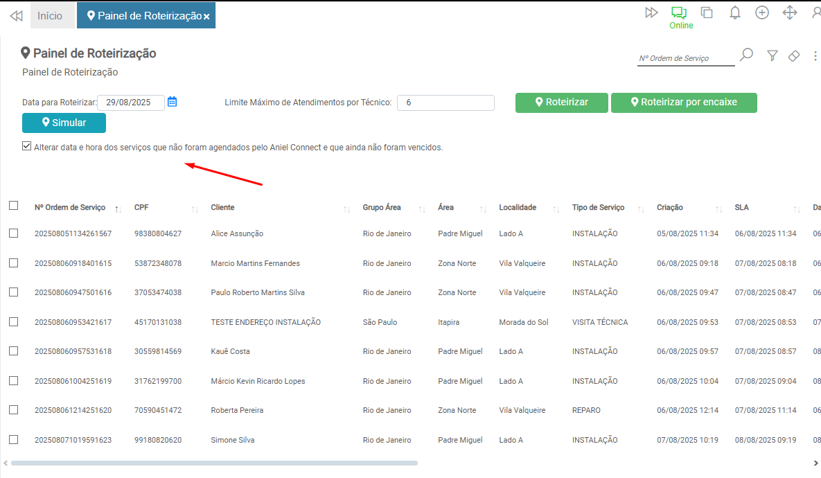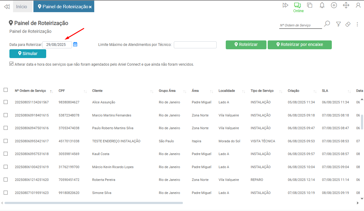 Para simular, informe a data de agendamento dos serviços no campo Data para Roteirizar.