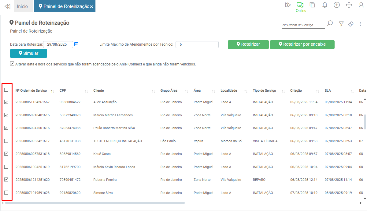 Para serviços agendados fora do Aniel Connect, como pelo aplicativo Olá Cliente ou por importação, siga o mesmo procedimento.