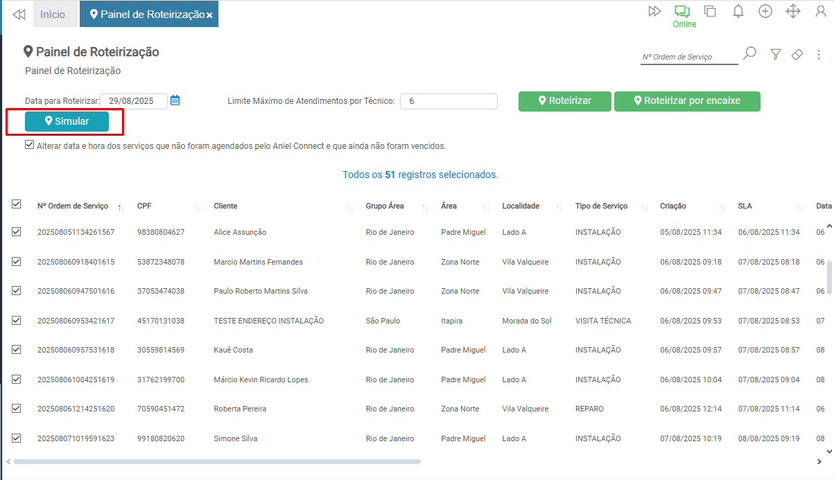 A simulação permite analisar os resultados dos critérios de distribuição antes de aplicá-los. O critério principal é a menor distância entre o ponto de partida do técnico e o endereço das ordens de serviço. Outros critérios devem ser definidos conforme as configurações da empresa para Ordem de Serviço.