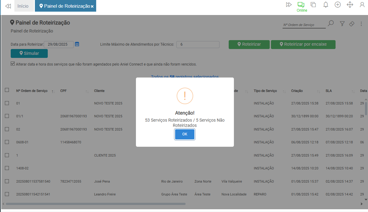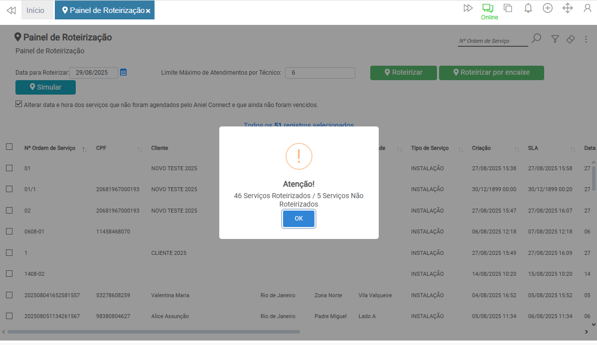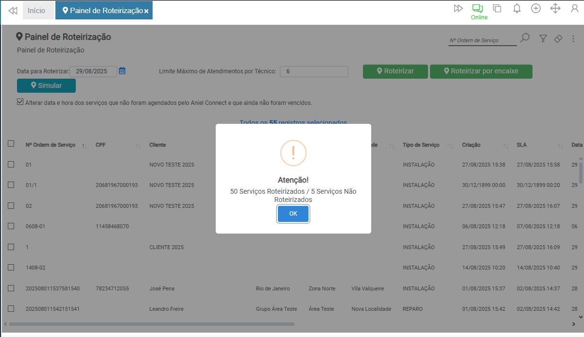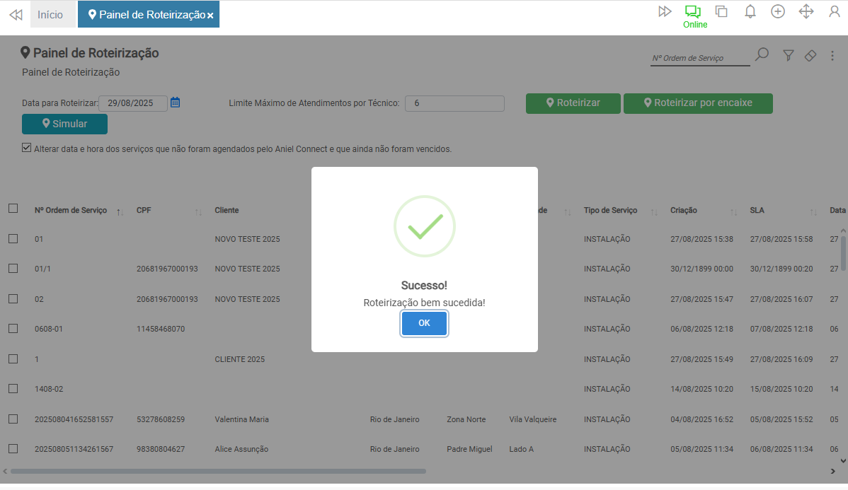 O Aniel Connect processará as informações de cadastros, localizações, status, situações e critérios de distribuição para simular a roteirização. Se todas as ordens de serviço puderem ser distribuídas, uma mensagem de sucesso será exibida, como abaixo: