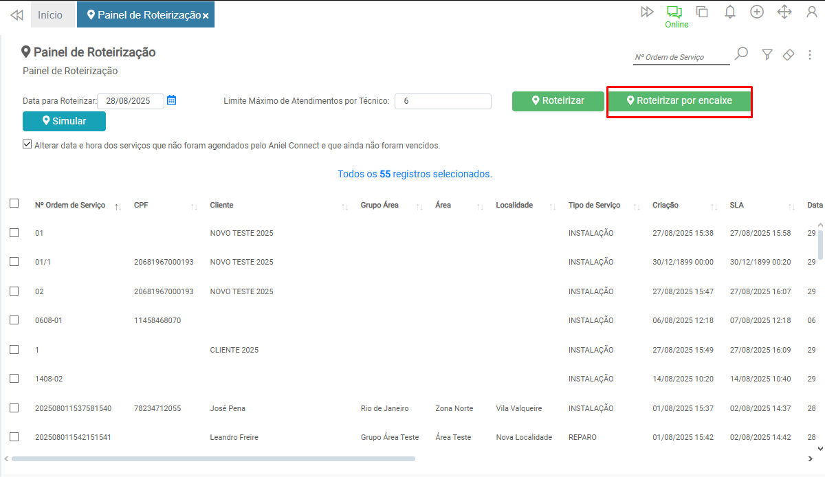 Para realizar a roteirização por encaixe, siga o mesmo processo da roteirização, mas clique no botão Roteirizar por Encaixe, localizado no canto superior direito.