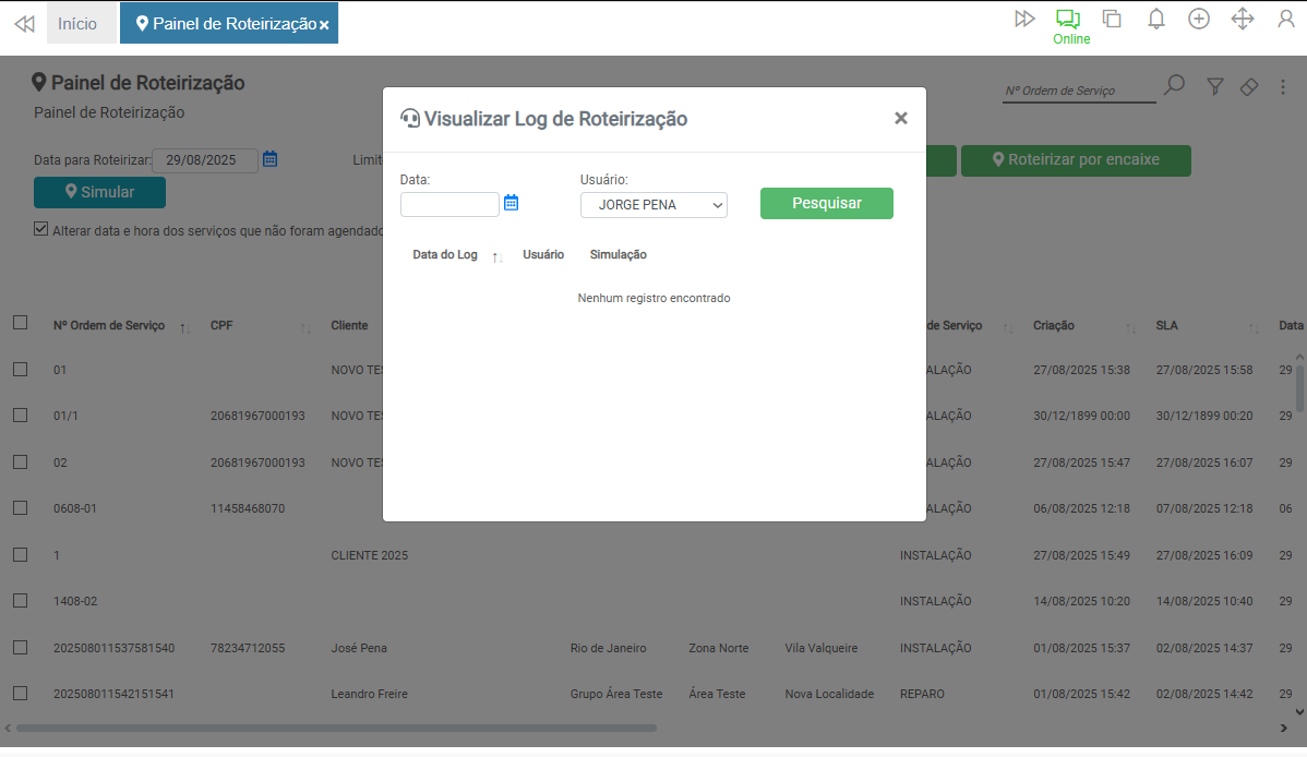 Informe a data da roteirização, selecione o usuário e clique em Pesquisar.