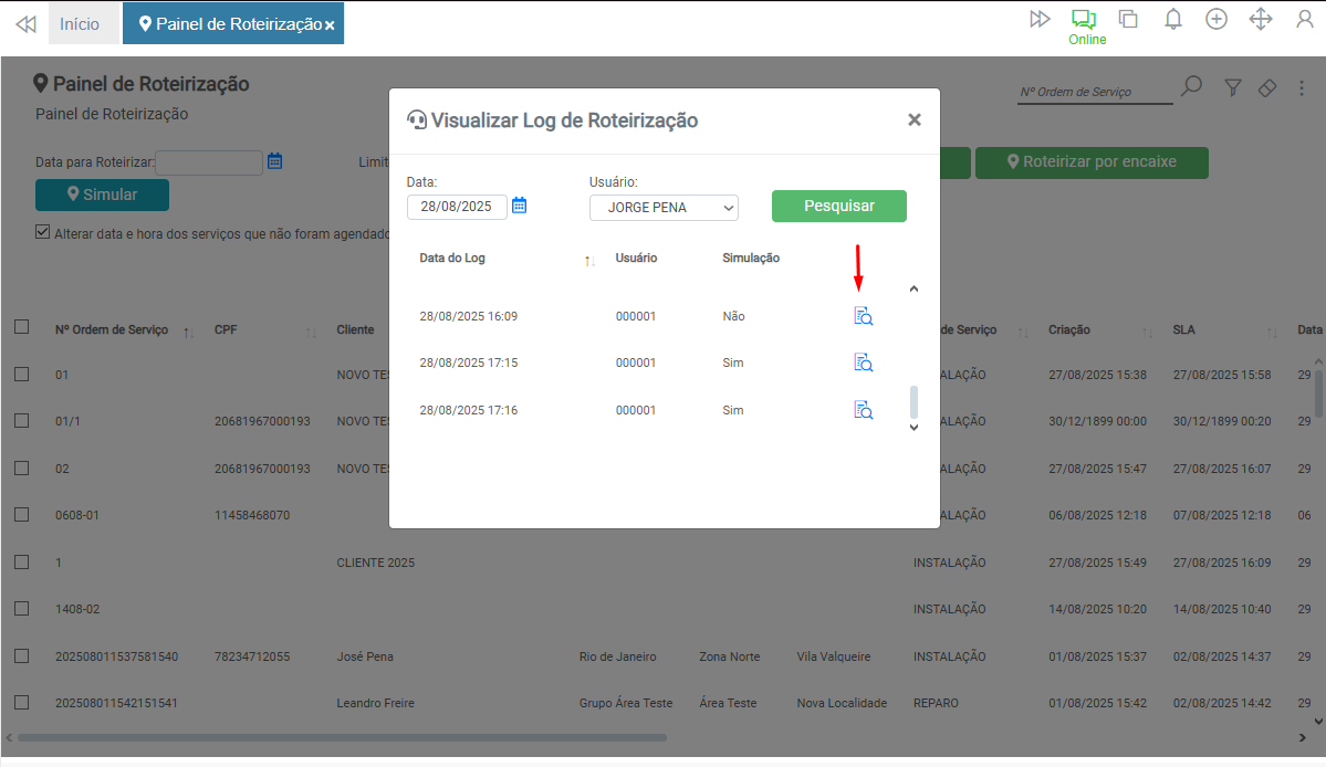 Os logs de simulações e roteirizações processadas serão exibidos. Clique no ícone de visualização à direita do log para ver os detalhes.