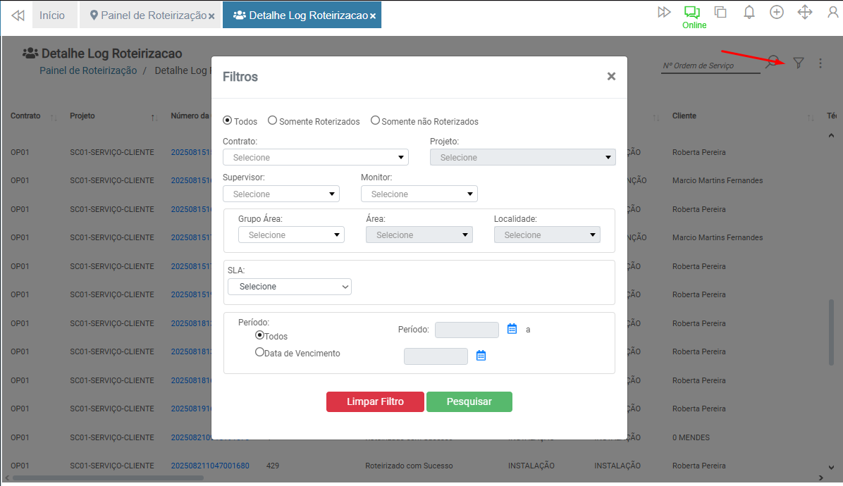 Na tela de visualização do log, para localizar ordens de serviço com características específicas, clique no ícone de funil no canto superior direito. As opções de filtro são: