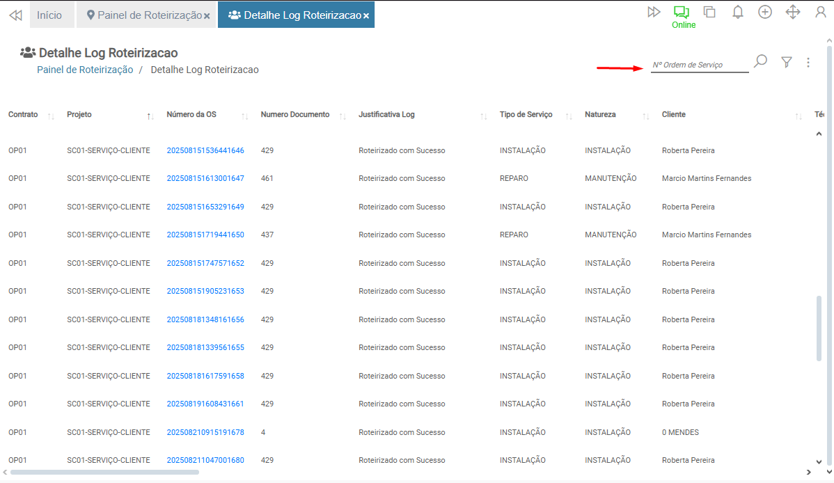Na coluna Número da OS, as ordens de serviço são links clicáveis.