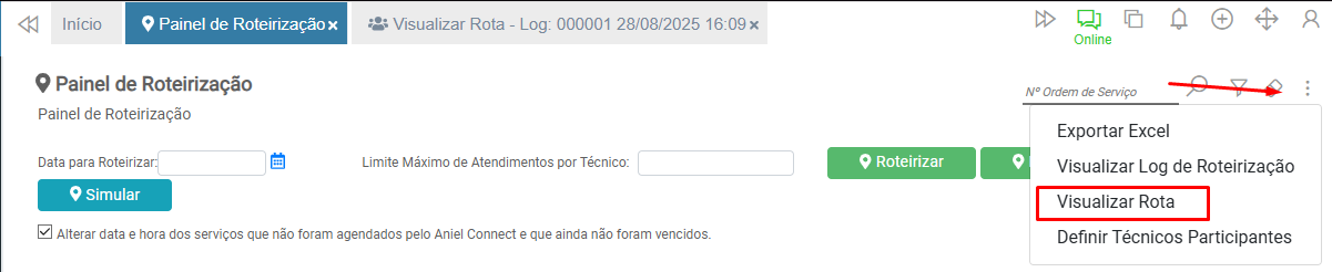 Para analisar os resultados da simulação ou roteirização, clique no menu de opções e selecione Visualizar Log de Roteirização.