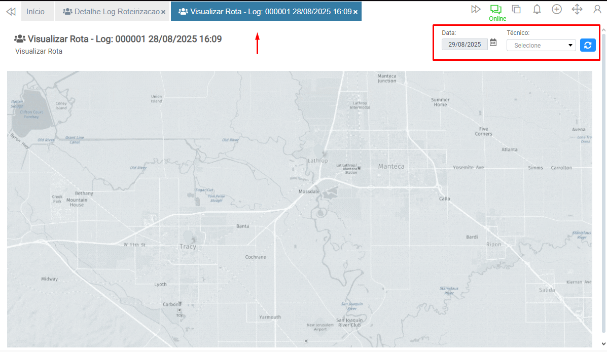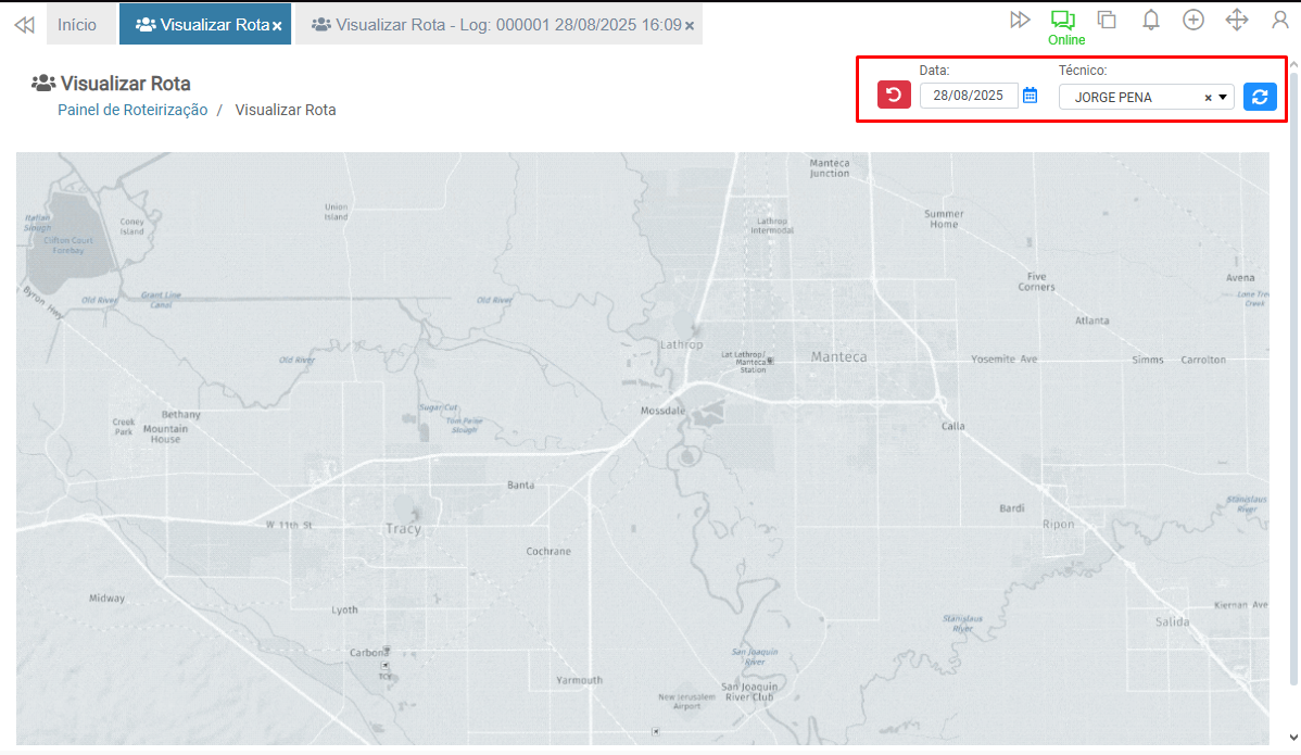 Diferentemente do painel de roteirização, a visualização a partir do log abre uma nova aba, eliminando a necessidade do botão Voltar e não permite atualizar a data, pois está vinculada ao log.