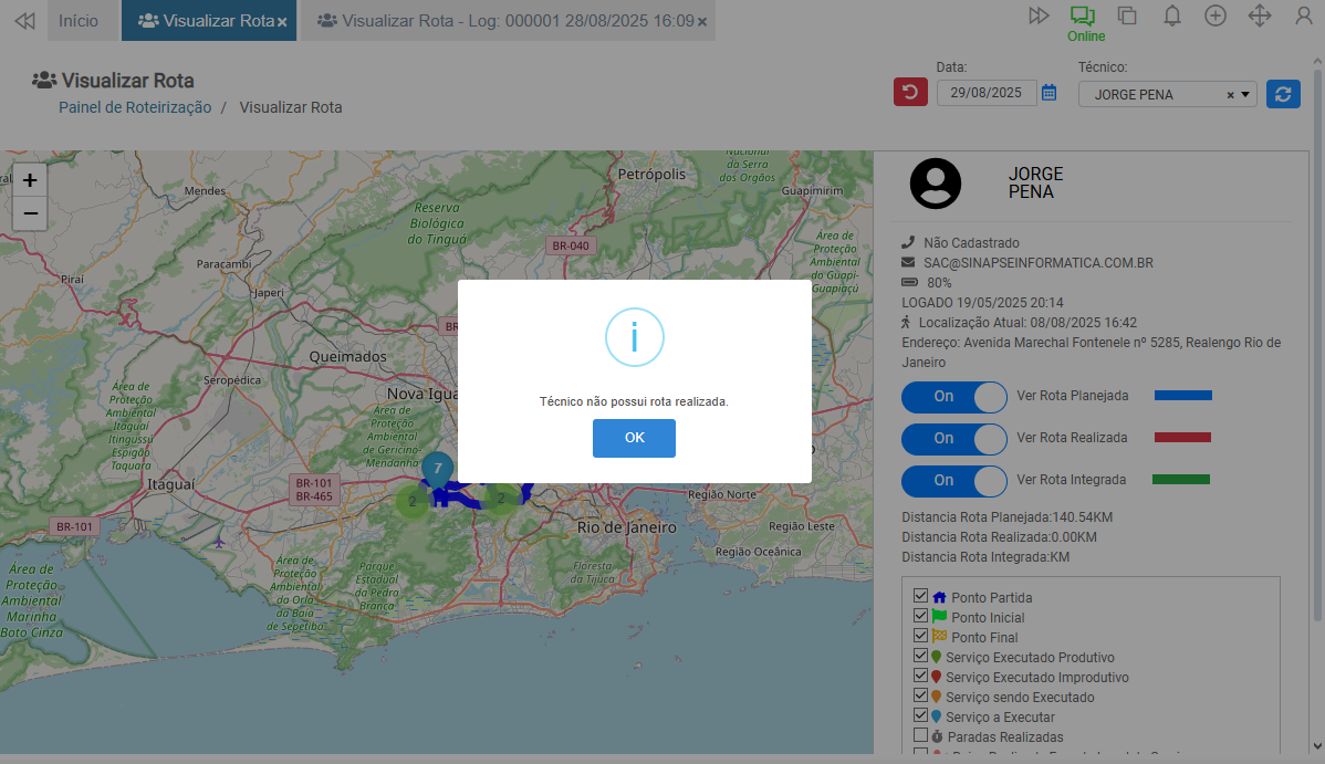 Se o técnico ainda não tiver realizado a rota, será exibida a mensagem abaixo: