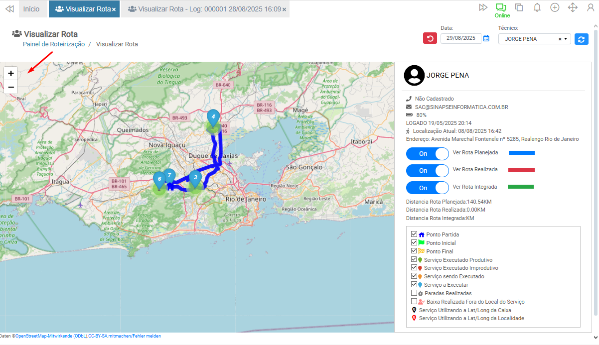 Clique em OK para visualizar a rota planejada. Use o scroll do mouse ou os botões + e - no canto superior direito para ajustar o zoom.
