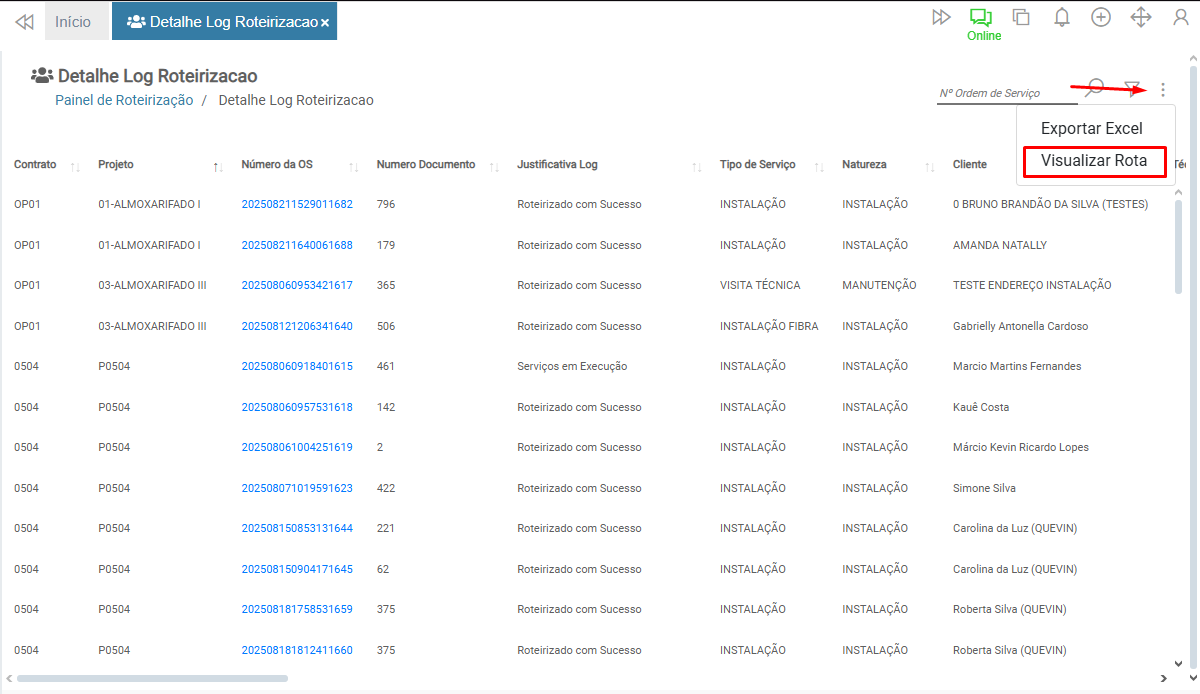 Para visualizar a rota a partir do log, clique no menu de opções e selecione Visualizar Rota.