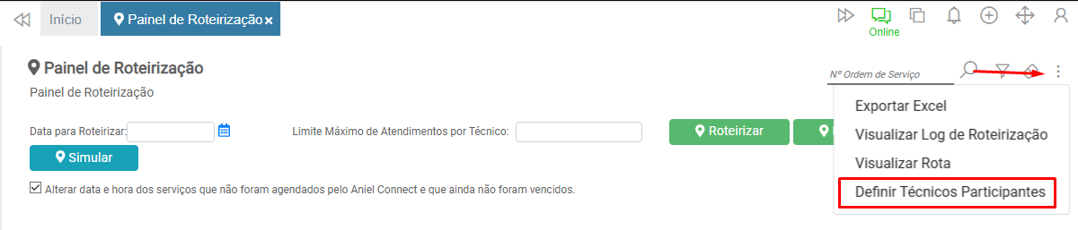 Para direcionar a roteirização a técnicos específicos, clique no menu de opções e selecione Definir Técnicos Participantes.