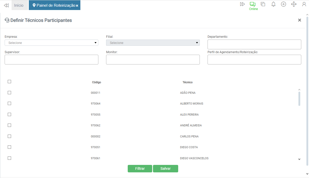 A tela seguinte exibe opções de filtros e a listagem de técnicos conforme o filtro aplicado. As opções de filtro são: