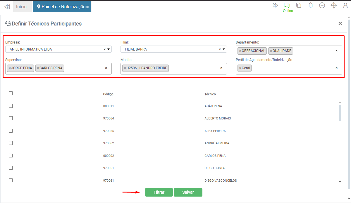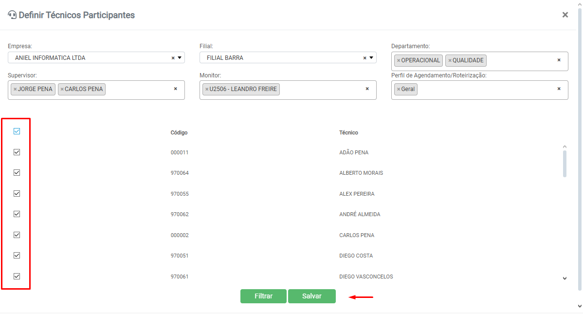 Selecione os técnicos desejados na coluna à esquerda, individualmente ou todos, e clique em Salvar.