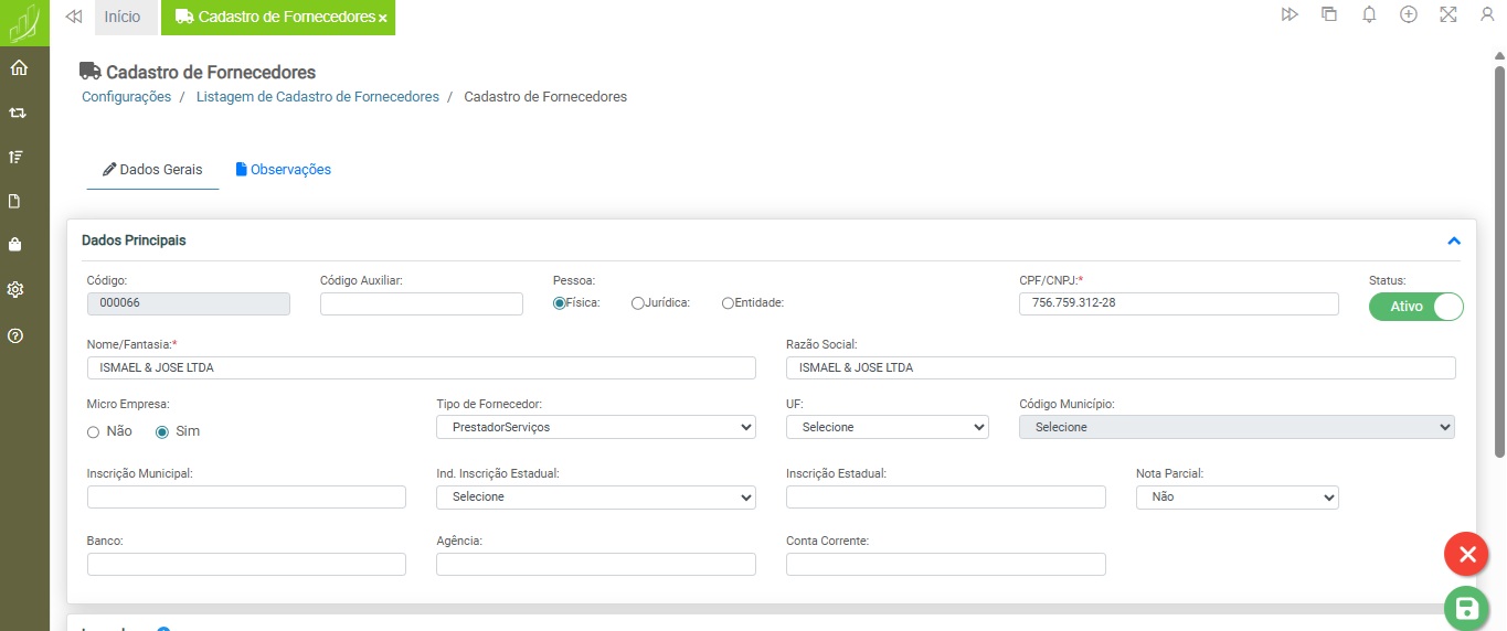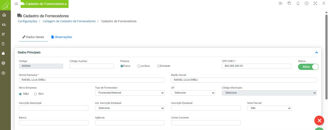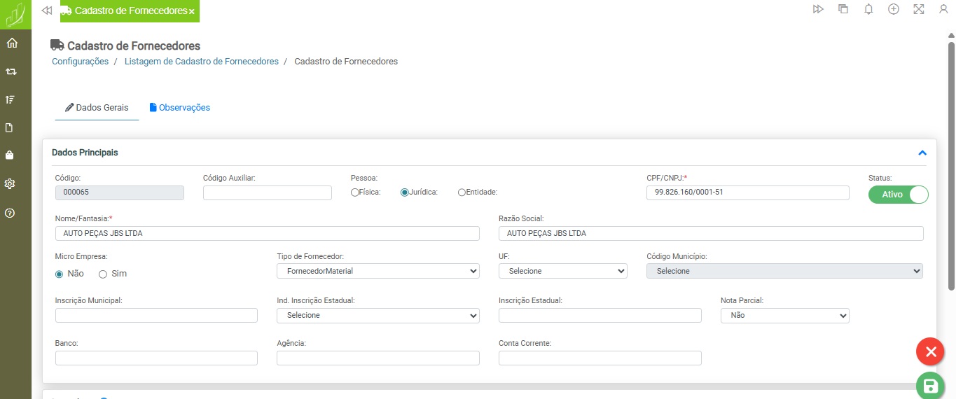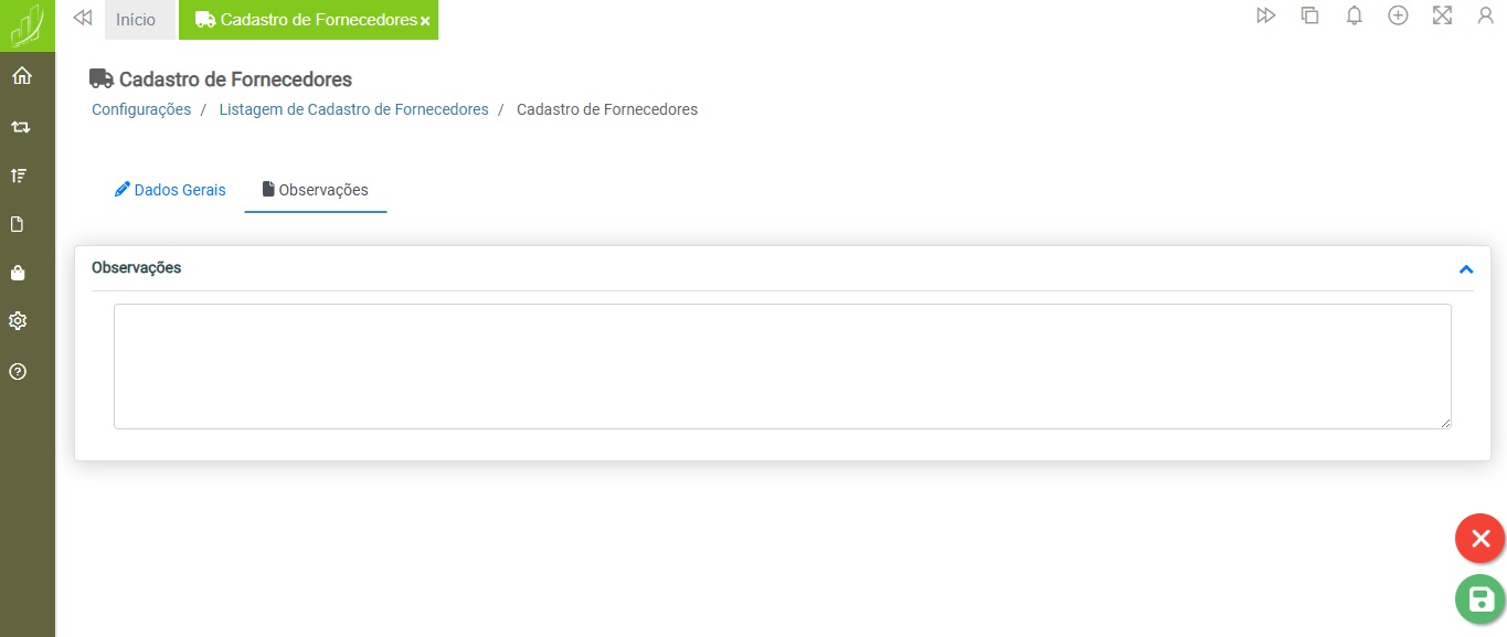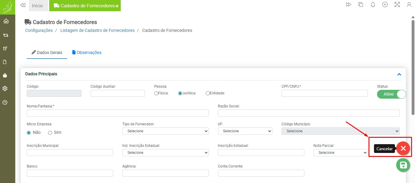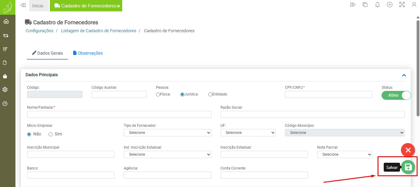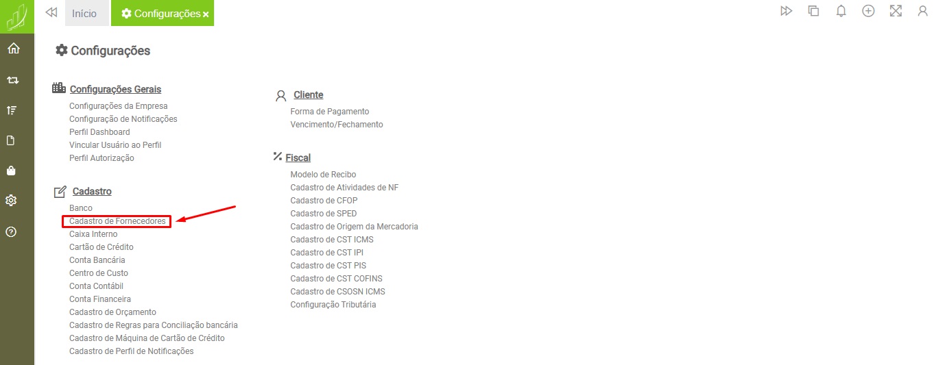 Configurações > Cadastro > Cadastro de Fornecedores