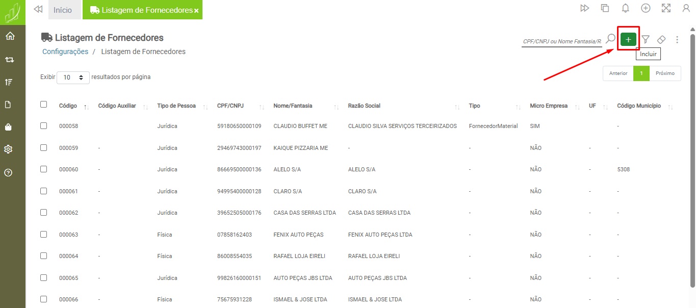 Para cadastrar um novo fornecedor, clique no botão “Incluir”: