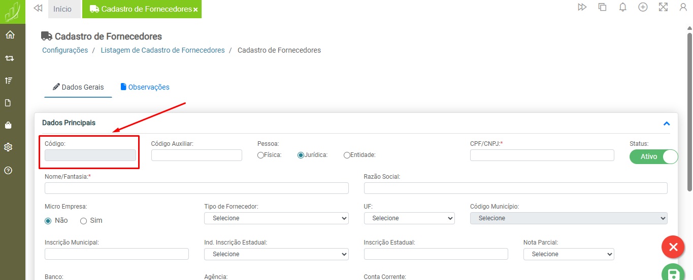 O campo “Código” será preenchido automaticamente pelo sistema.