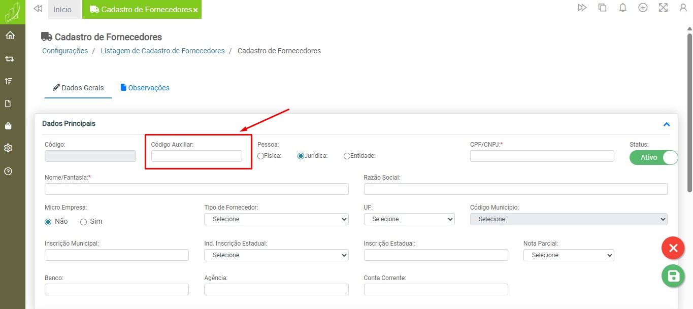 O campo “Código Auxiliar” é um campo de preenchimento livre, caso o usuário deseje inserir um segundo código para uma melhor identificação.