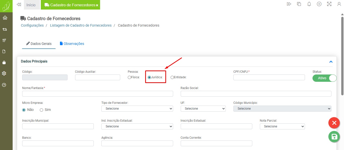 Os tipos de pessoa disponíveis são Física, Jurídica e Entidade. Por padrão, a opção “Jurídica” estará selecionada.