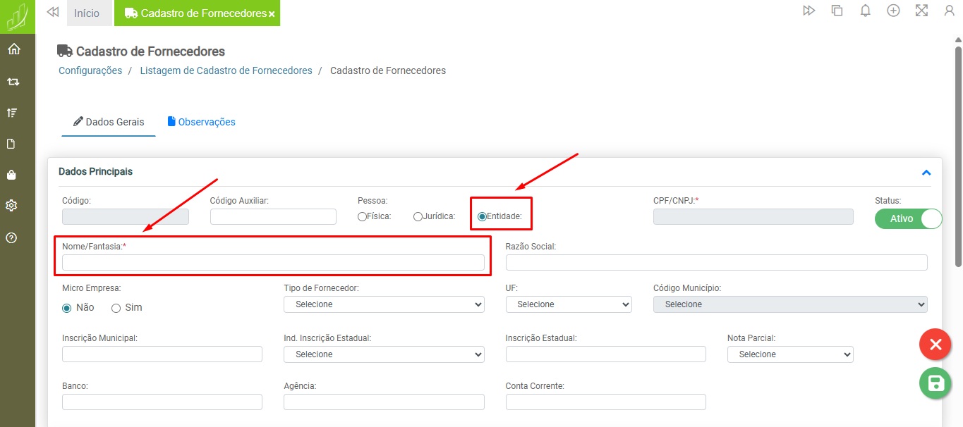 Os campos “CPF/CNPJ” e “Nome/Fantasia” são obrigatórios para o cadastro de Pessoas Físicas e/ou Jurídicas. E para o cadastro de Entidade, somente o campo “Nome/Fantasia” será obrigatório.