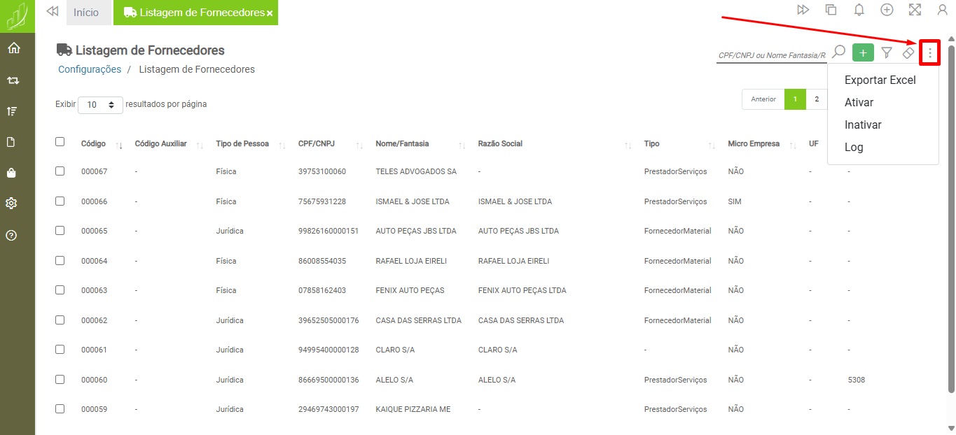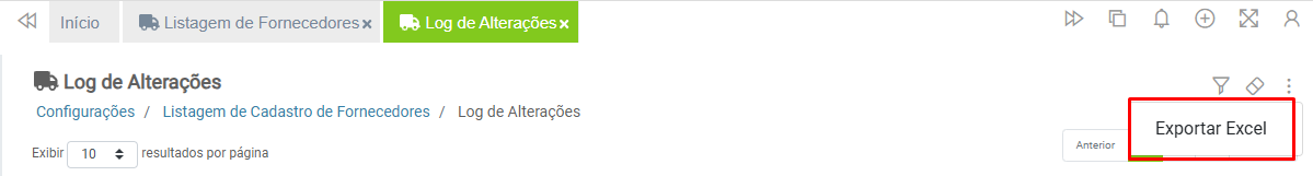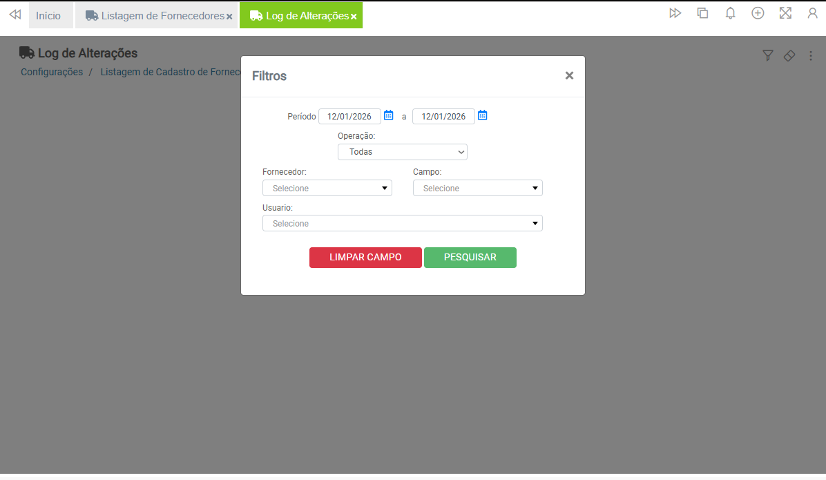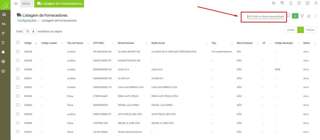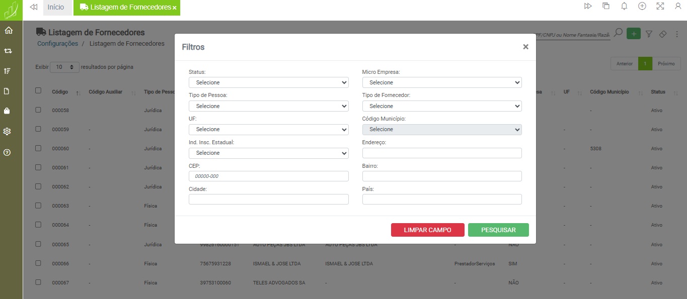 A Listagem de Fornecedores possui filtros para facilitar a localização de registros realizados pelo próprio usuário ou por outro usuário que também possua acesso ao recurso.