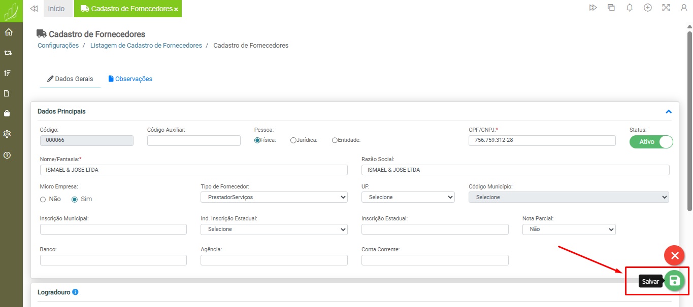 E após o preenchimento dos campos e demais informações relativas ao cadastro, clique no botão "Salvar" para concluir o registro.