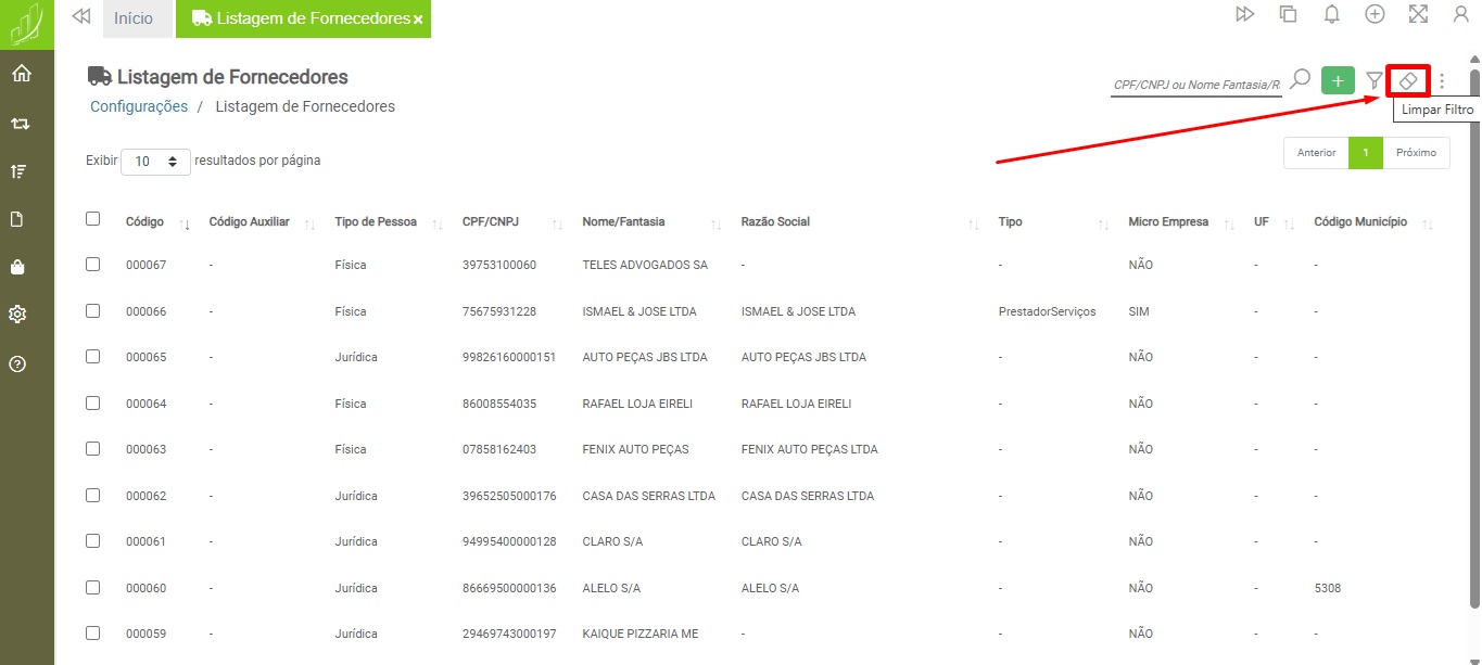 O sistema também possui um botão para limpeza dos filtros aplicados, caso o usuário necessite realizar outro tipo de filtro.