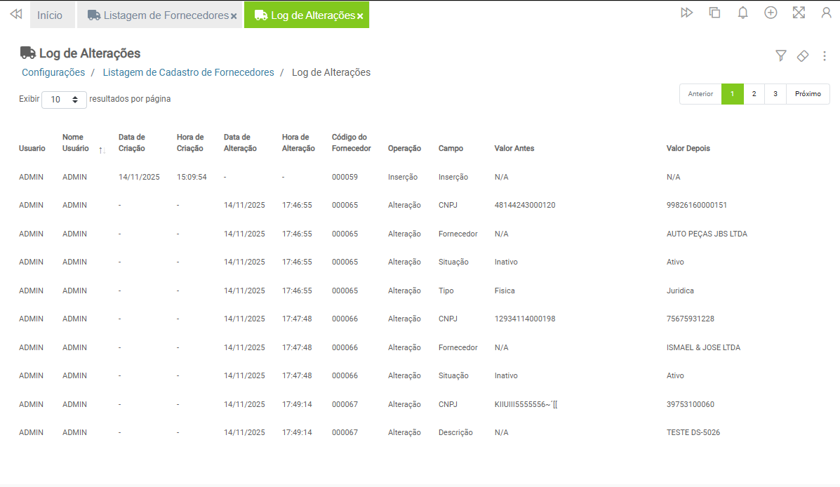 4. Log: Apresenta o log de alterações dos cadastros.