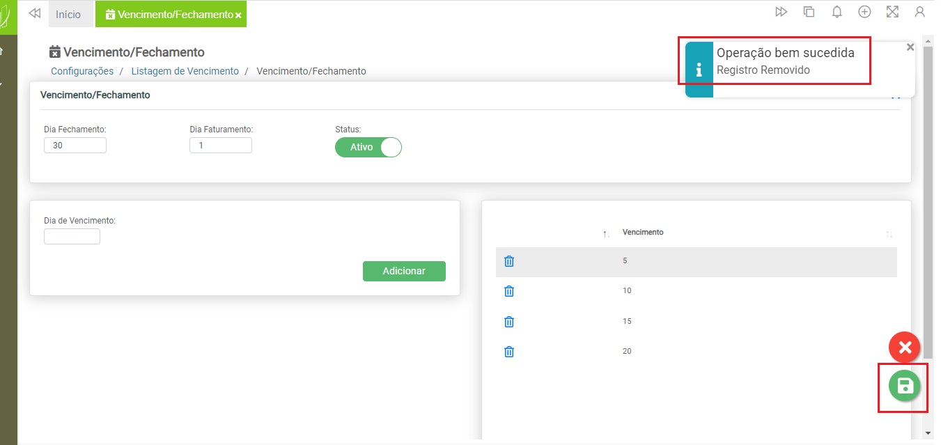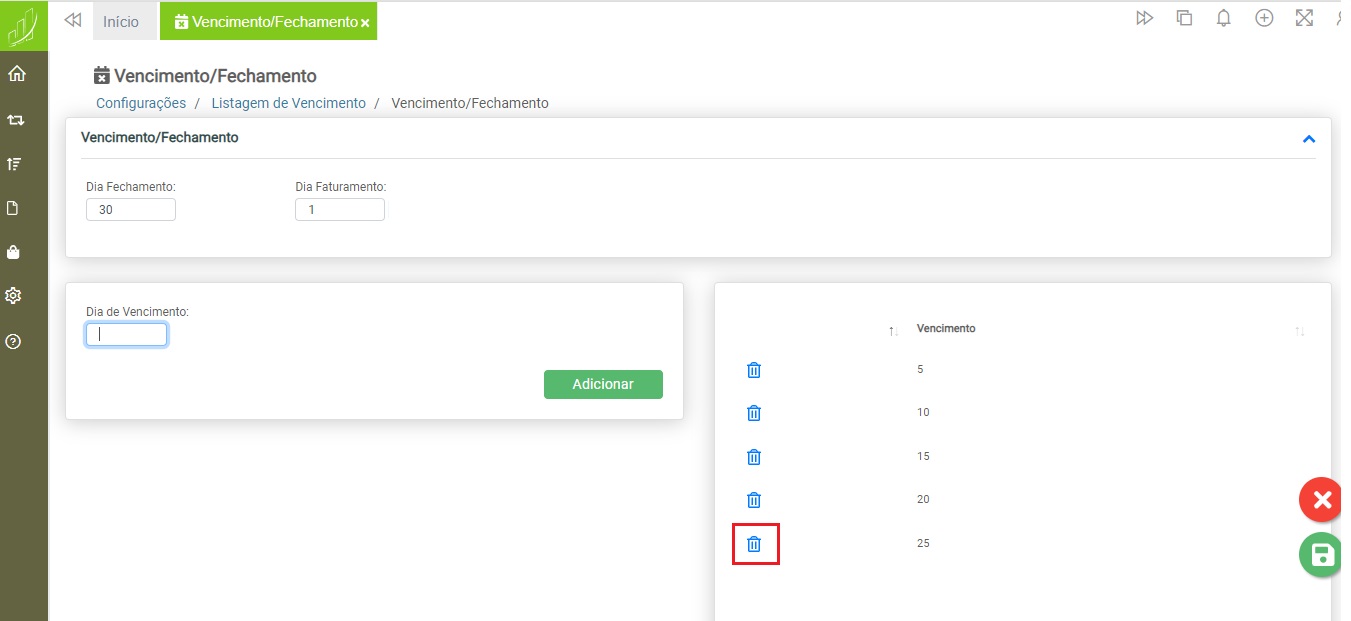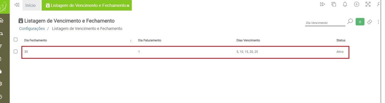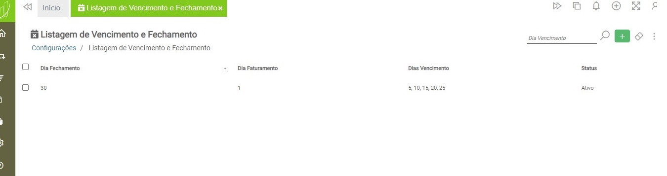 Para inserir os dias de vencimento, insira o dia desejado no campo Dia de Vencimento e, em seguida, clique no botão Adicionar e o dia será listado no bloco ao lado.