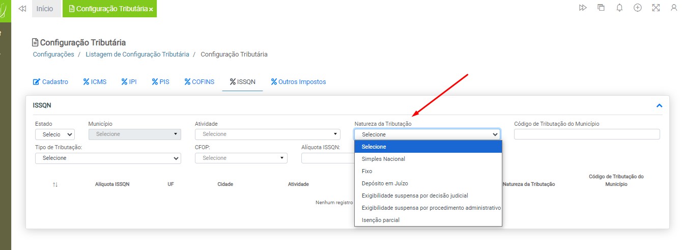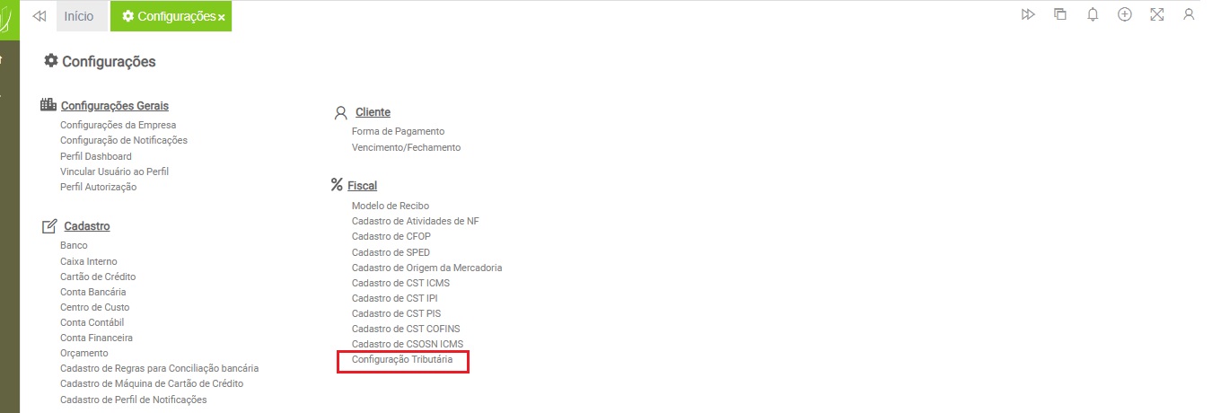 Configurações > Grupo Fiscal > Configuração Tributária
