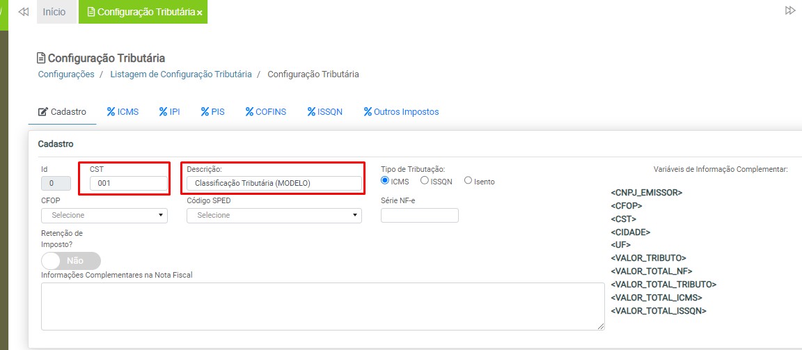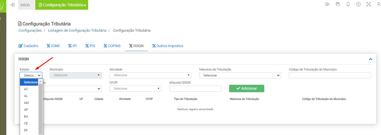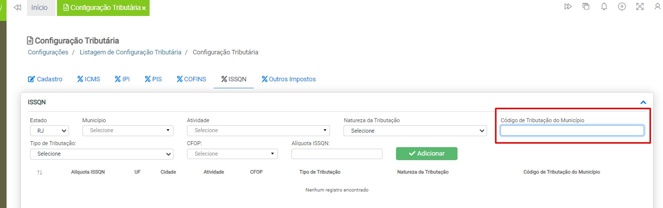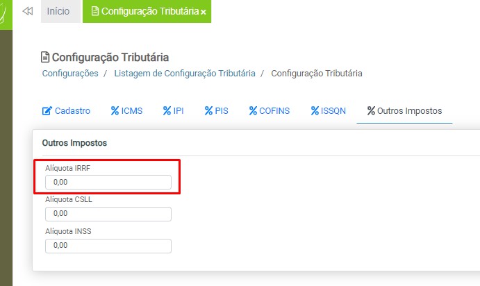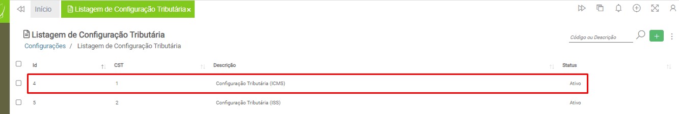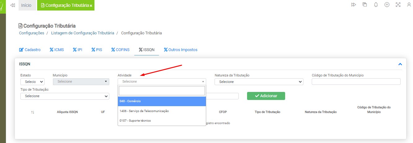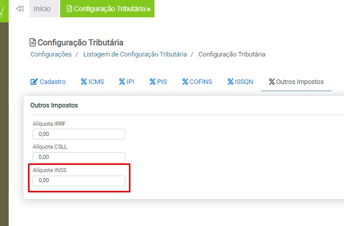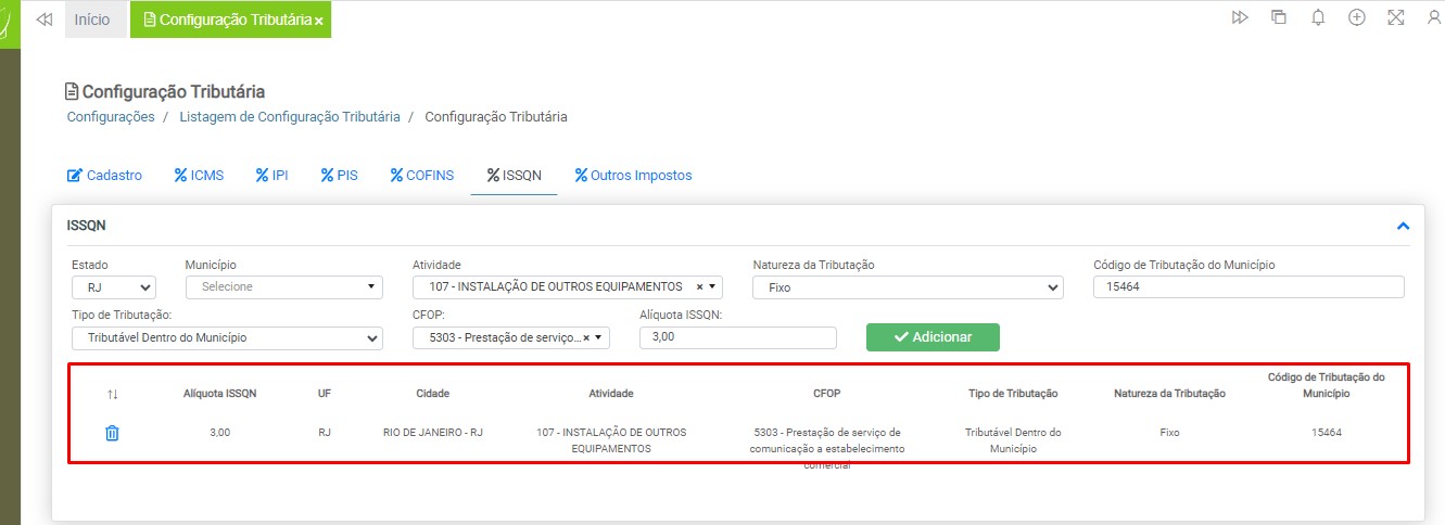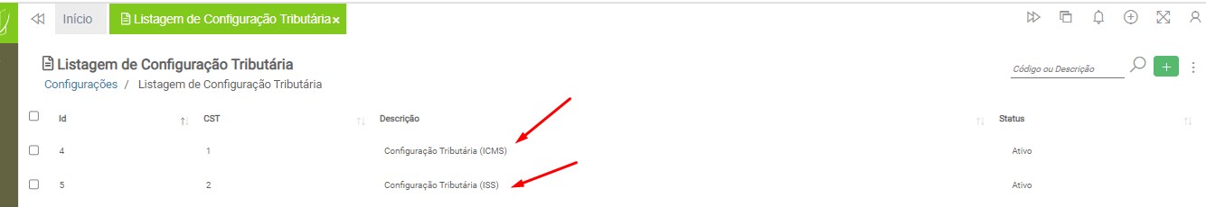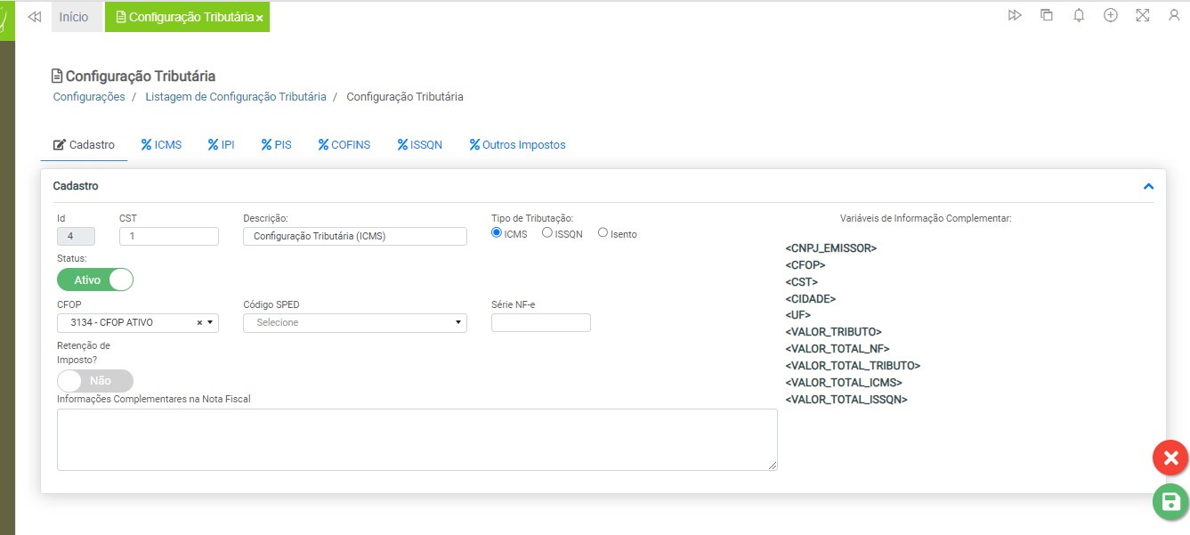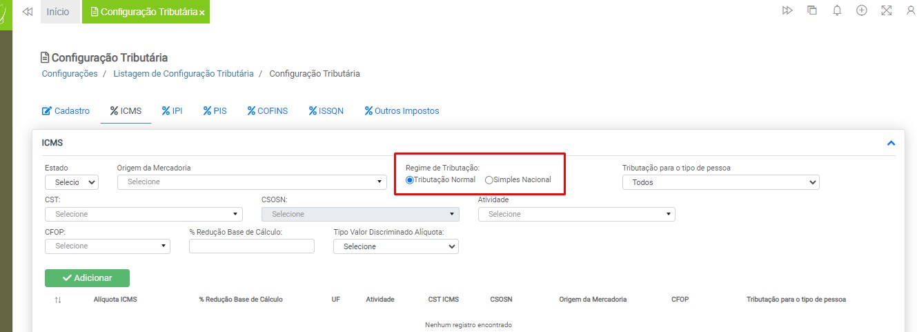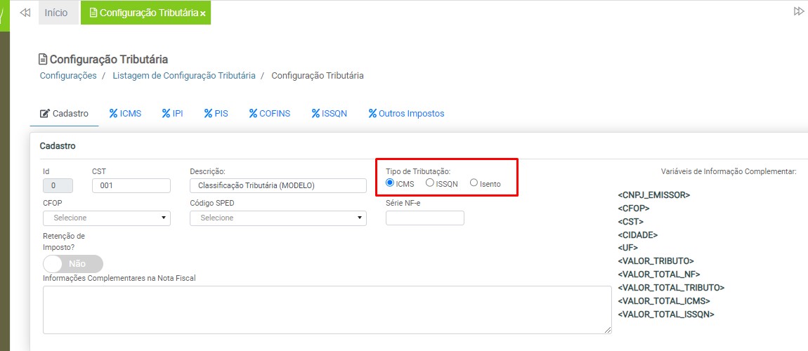 Observação: será necessário cadastrar uma configuração tributária para cada tipo de tributação (ICMS ou ISS), devido à carga de impostos específicos para cada modelo de nota fiscal.