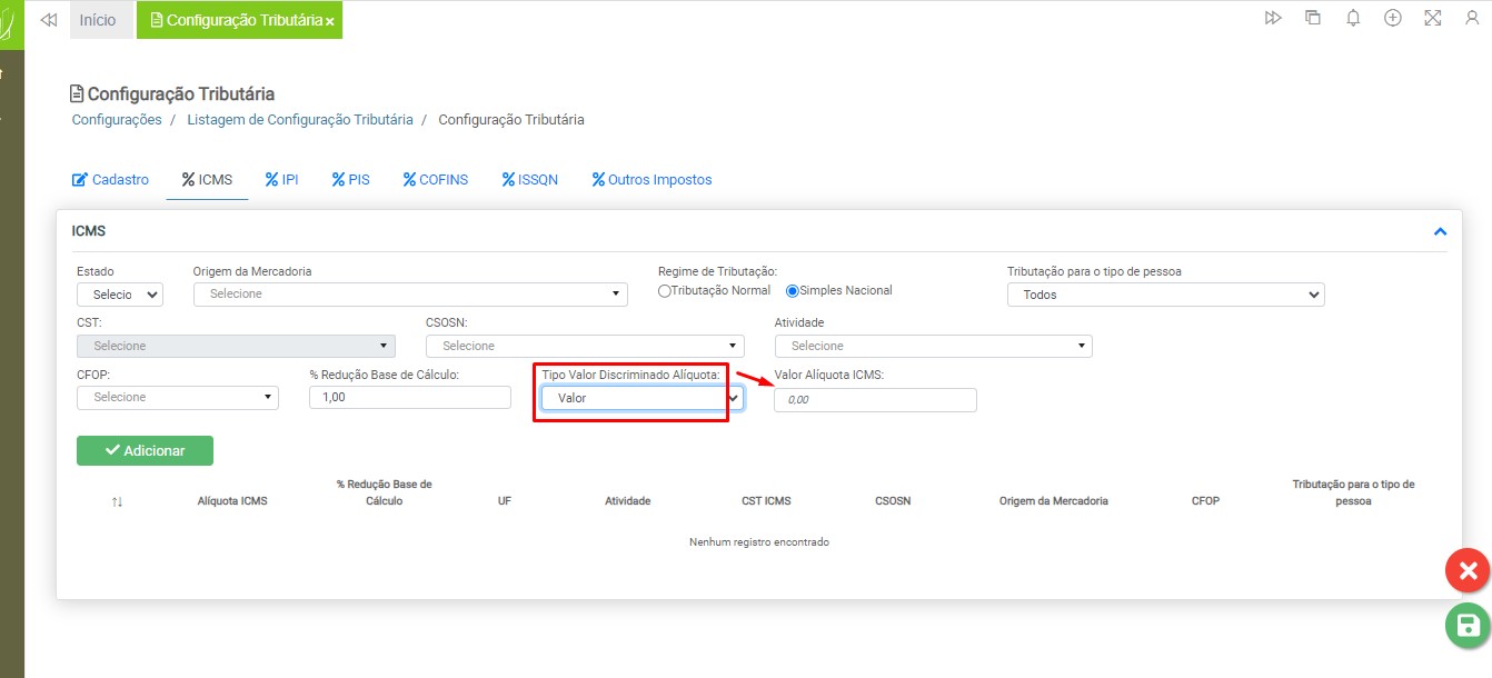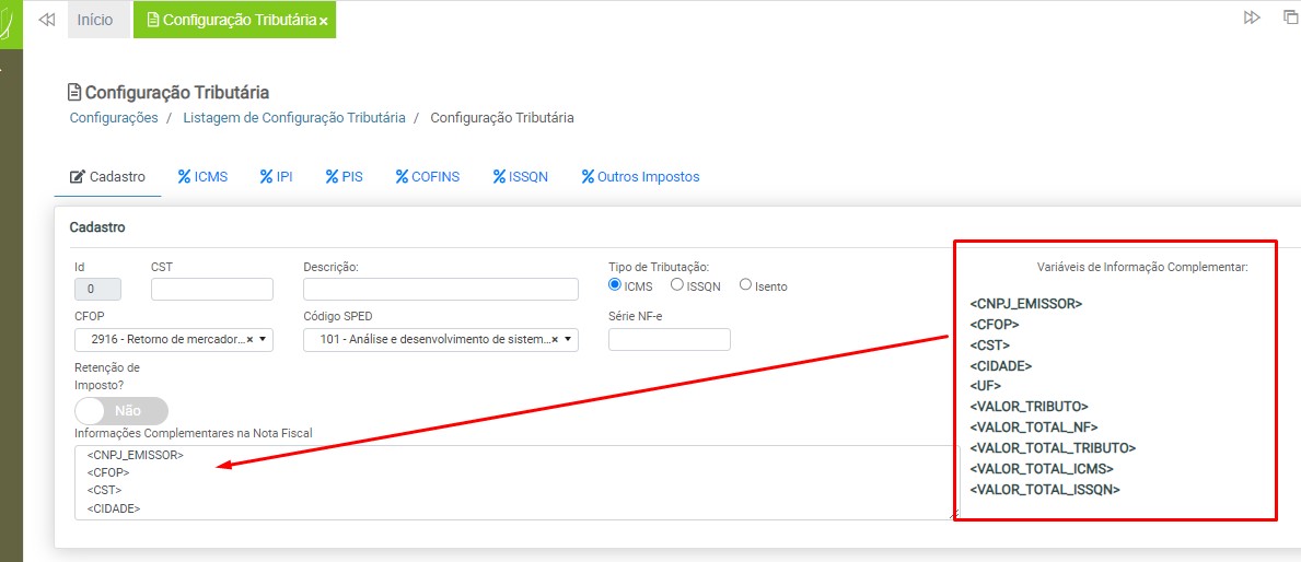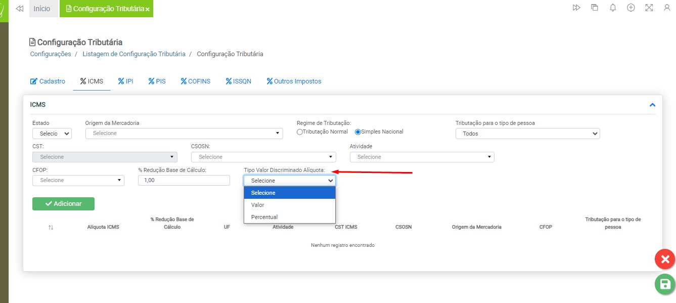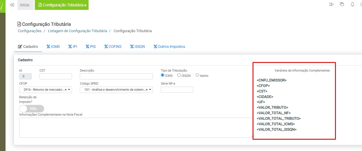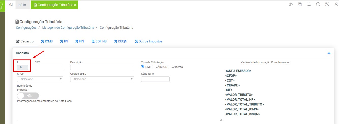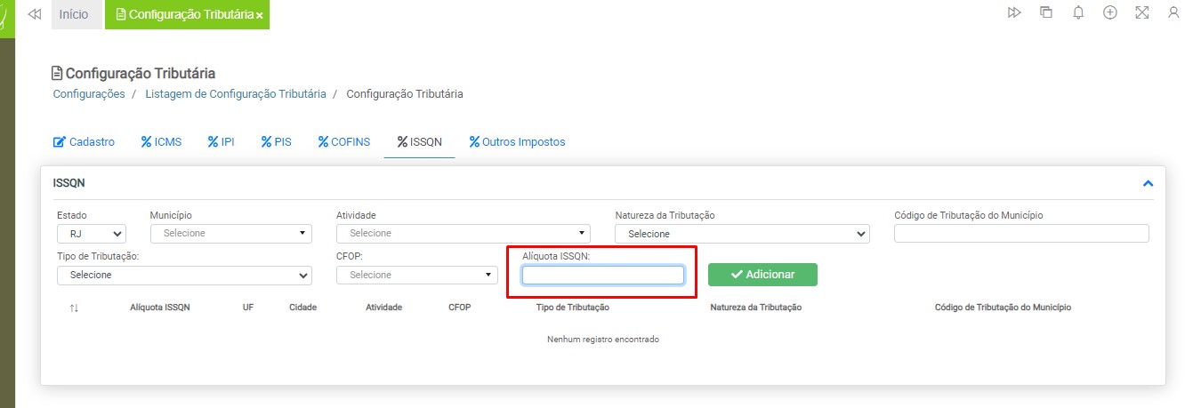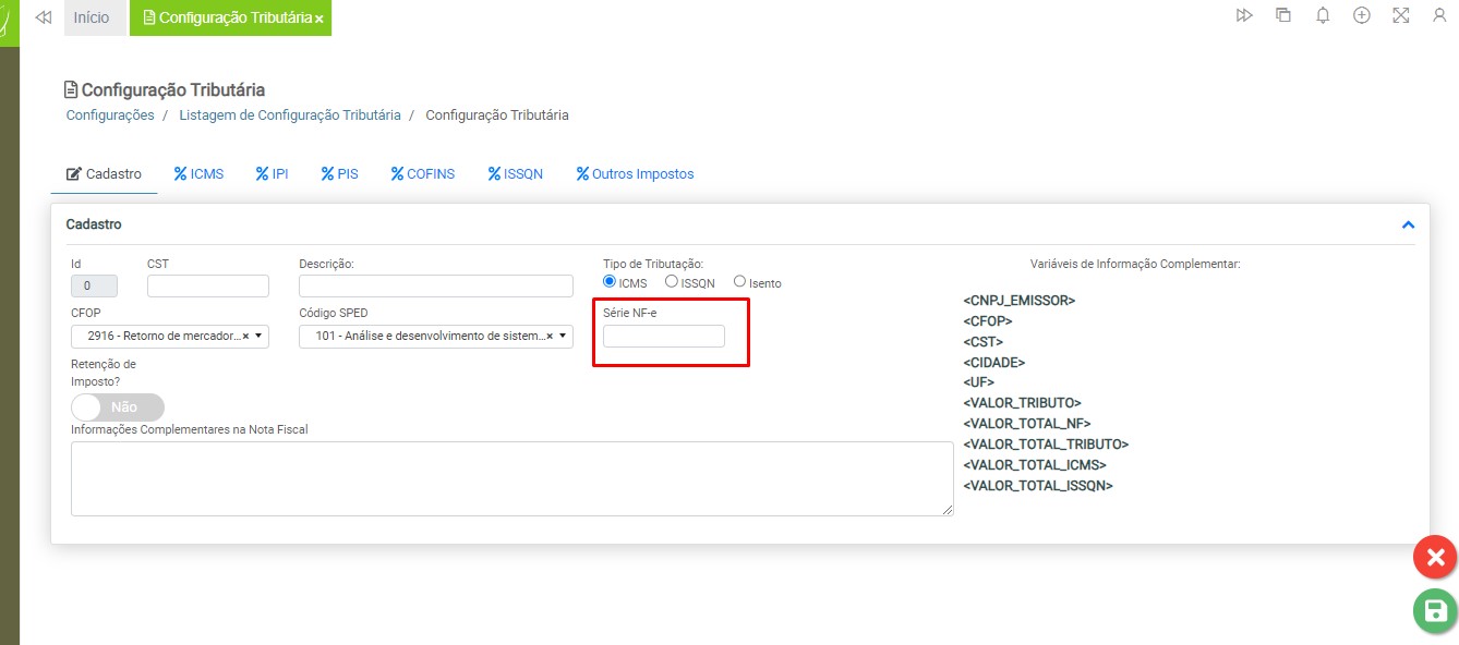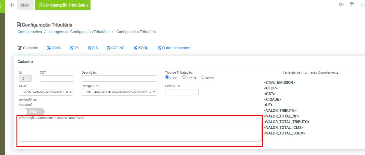 Observação: será necessário cadastrar uma configuração tributária para cada tipo de tributação (ICMS ou ISS), devido à carga de impostos específicos para cada modelo de nota fiscal.