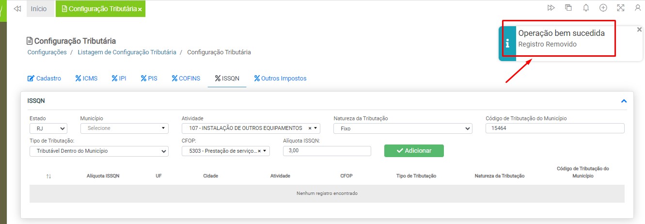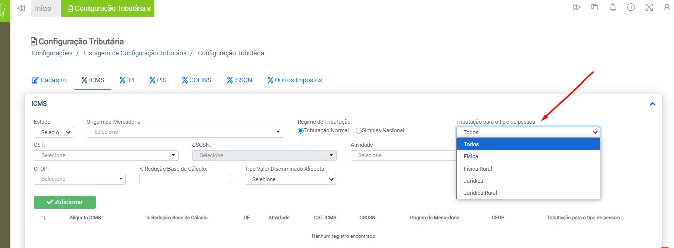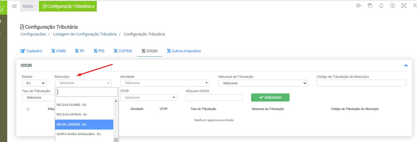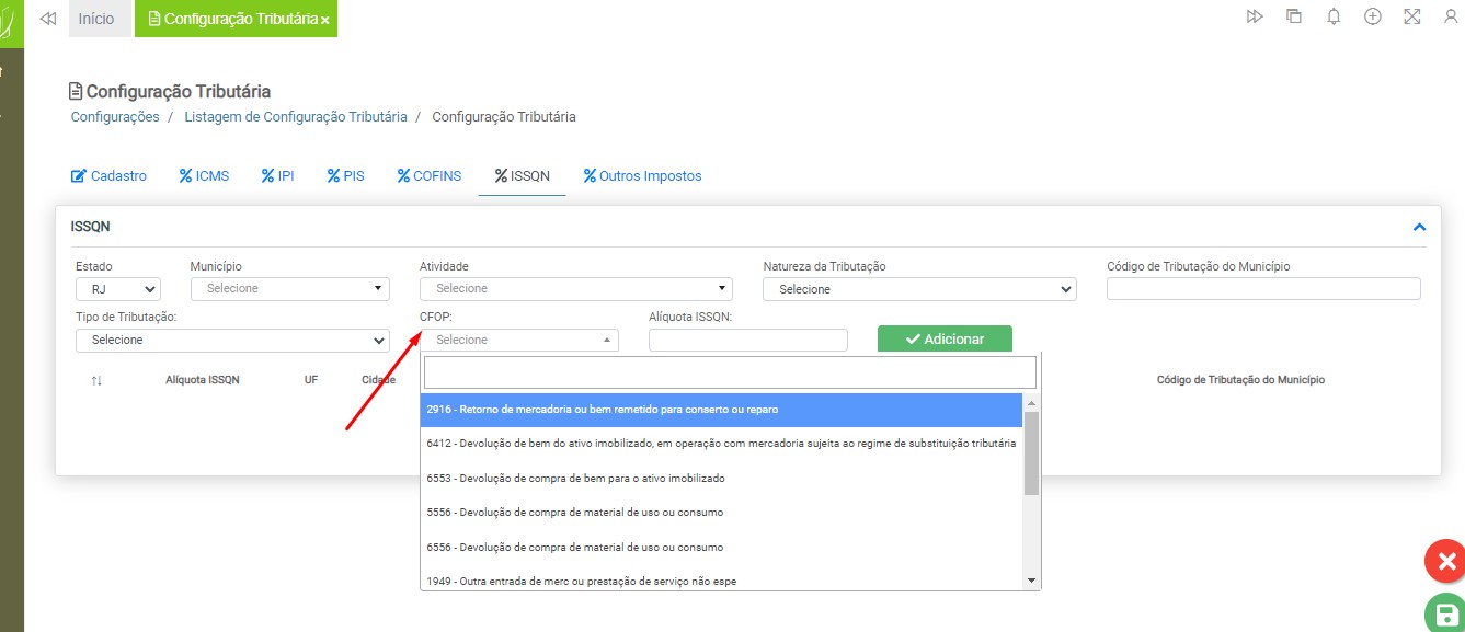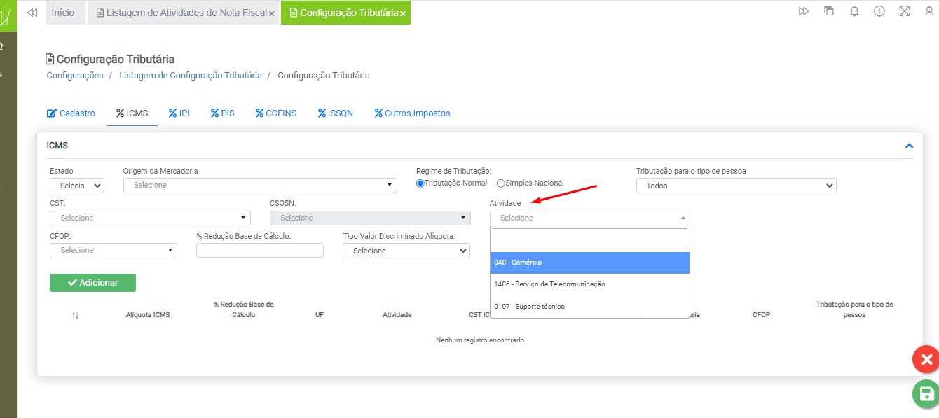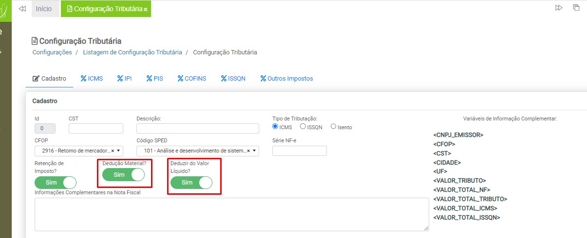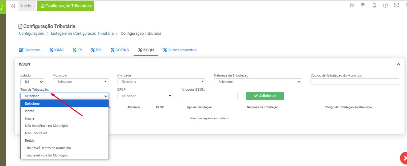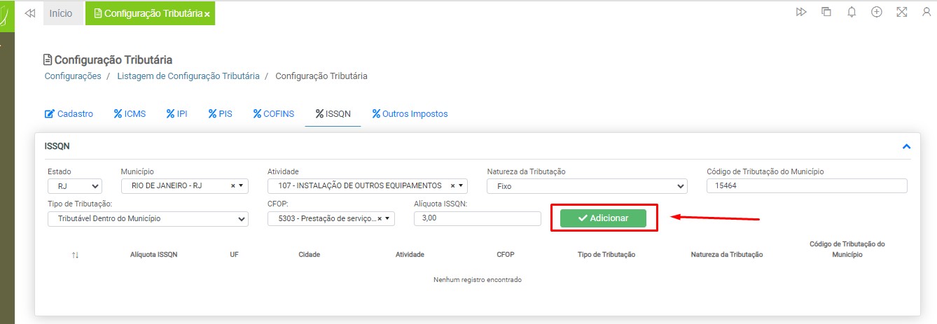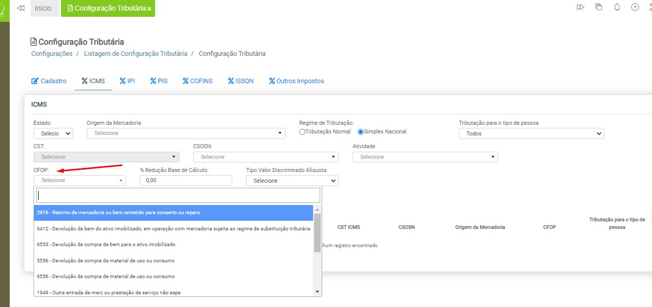 Observação: será necessário cadastrar uma configuração tributária para cada tipo de tributação (ICMS ou ISS), devido à carga de impostos específicos para cada modelo de nota fiscal.