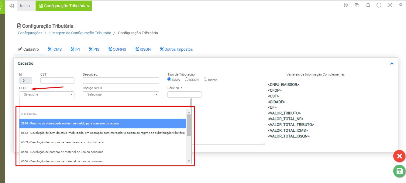 CFOP – Selecione o CFOP entre as opções disponíveis na listagem. O cadastro de CFOP é realizado pelo usuário. Em caso de dúvidas, acesse a instrução Cadastro de CFOP para mais informações.